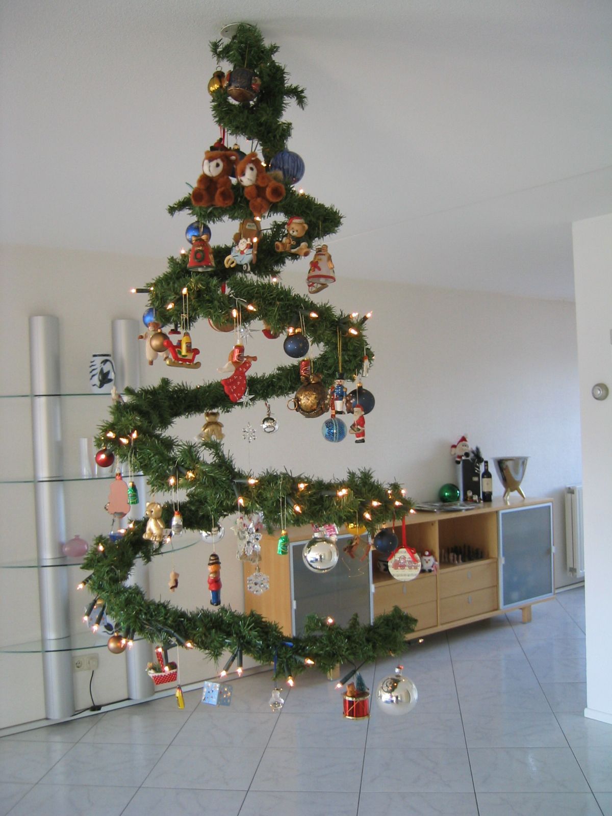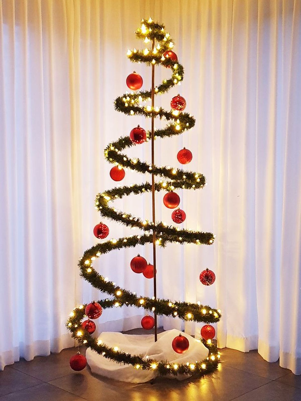 Una estructura en espiral montada desde el techo redefine la forma tradicional. Con luces enrolladas, crea un efecto creativo y contemporáneo, ideal si hay niños o mascotas y buscás evitar accidentes.