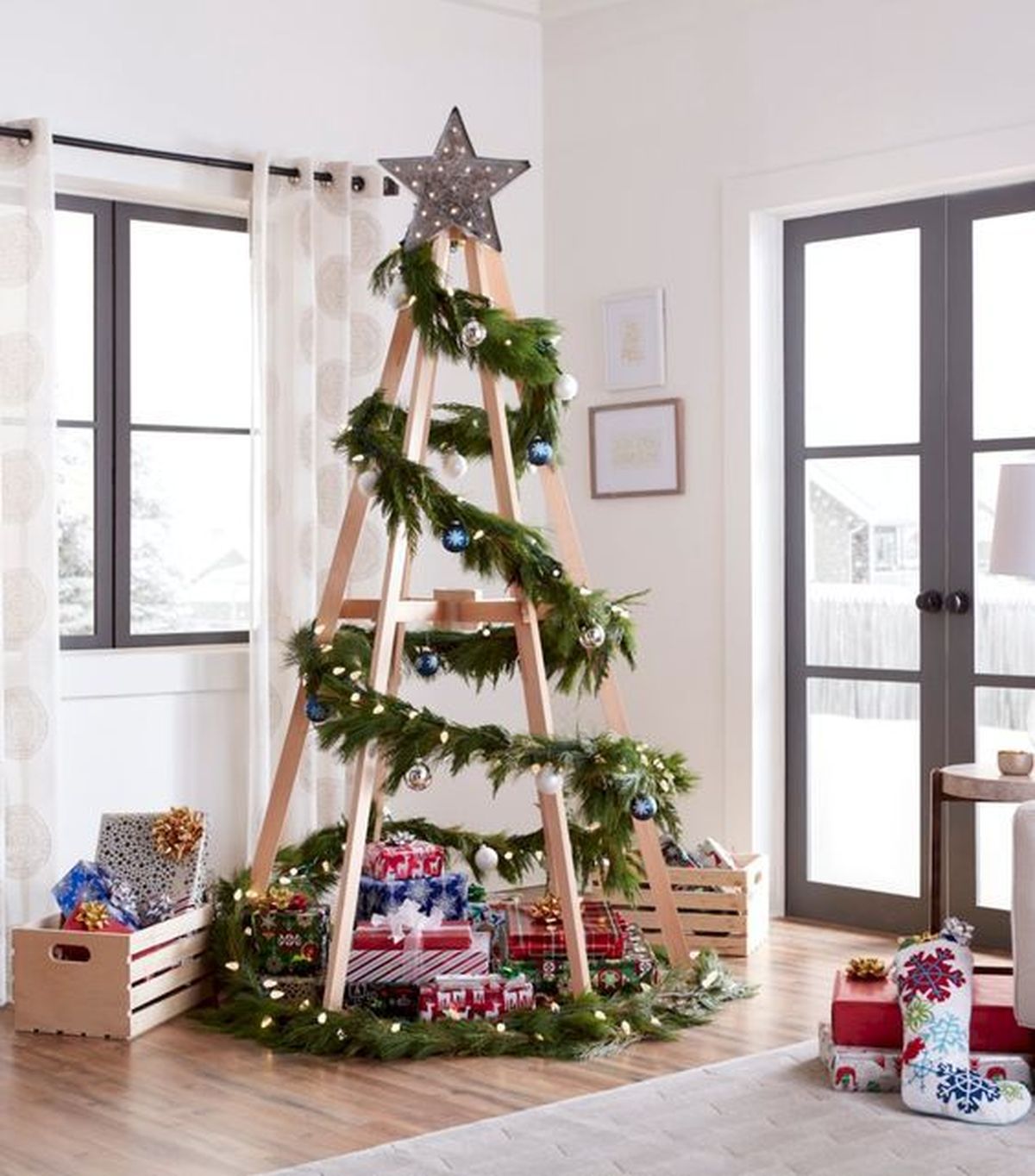 Usando sólo unos palos de madera y guirnaldas, se construye una estructura en forma de pirámide. El resultado: un árbol de diseño escandinavo, económico, fácil de armar y guardar, y con encanto rústico-moderno.