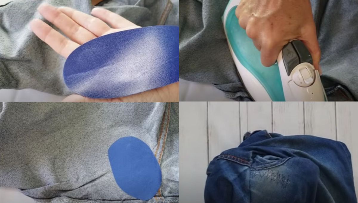 Para arreglar un pantalón roto en la entrepierna solo hace falta un pequeño truco de costura en el hogar. Vas a necesitar un poco de hilo, una aguja y un parche autoadhesivo color azul para ropa.