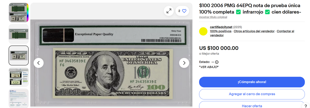 El billete de 100 dólares que vale 100.000 dólares está siendo vendido a través del sitio Ebay. Está en excelente calidad y fue impreso en el 2006, pero tiene una salvedad. Solamente su frente se ve bien. En tanto, su reverso tiene un marcado error de impresión que es imposible de ignorar.