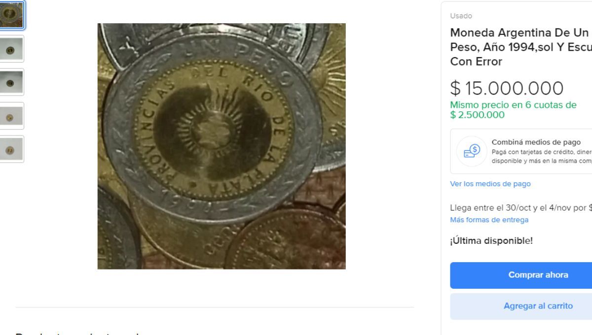 El poseedor de este raro ejemplar busca poder vender esta moneda de 1 peso en $ 15.000.000 a través de la plataforma de compra y venta de Mercado Libre y de esa manera ganar mucho dinero en el mundo de los coleccionistas y amantes de la numismática.