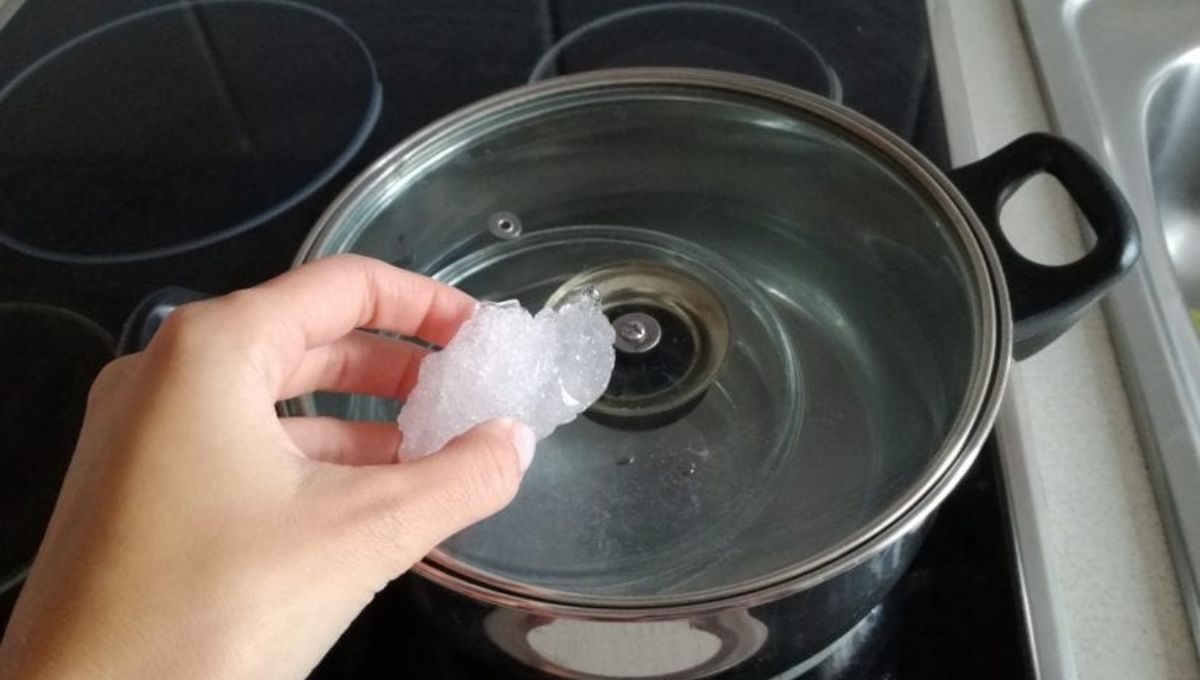 Paso 5: Para acelerar el proceso de condensación y evitar que el vapor se escape, coloca un poco de hielo en la tapa de la olla. Esto enfriará la superficie rápidamente y hará que el vapor se condense más fácilmente en gotas de agua que caerán en el recipiente.
