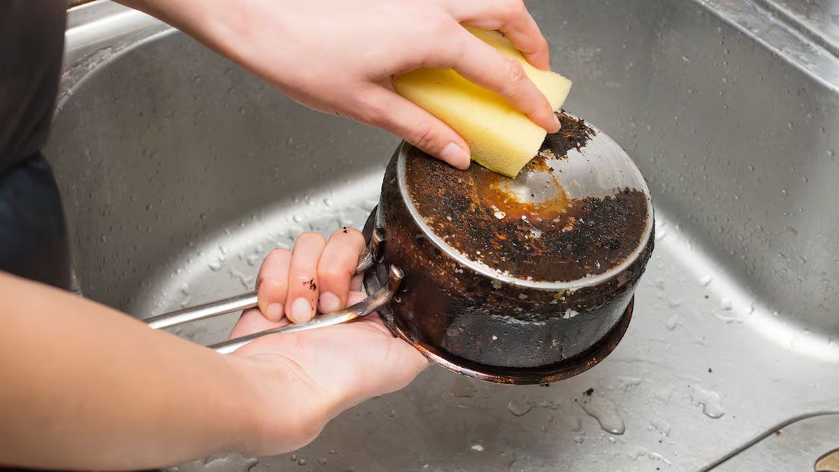 - Llenar la bacha de la cocina con agua caliente y sumergir por completo las ollas o cacerolas por algunos minutos.