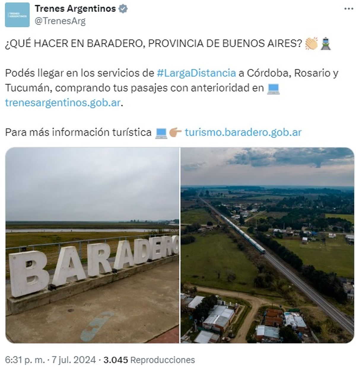 - Tren Buenos Aires-Córdoba: presta servicio los miércoles y domingos y también parte desde Retiro, aunque en este caso en el horario de 11.30. Llega a Baradero a las 14.18 y el pasaje tiene los mismos costos que se detallan arriba.