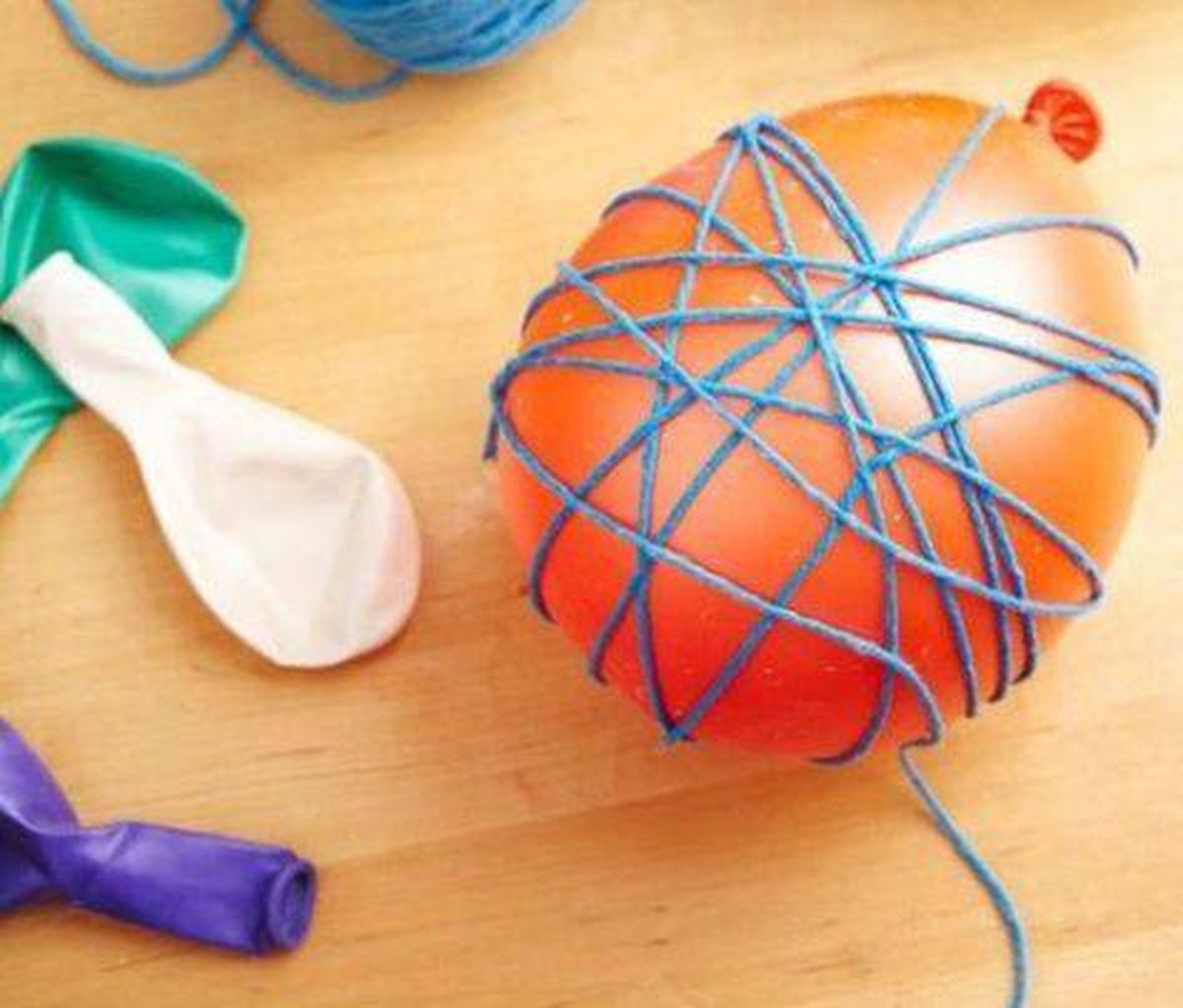 Luego toma el hilo de algodón y comienza a enrollar por todo el globo, de manera que quede una especie de entretejido. Ocupa un color distintos por cada globo si quieres para que sea más colorido o si prefieres pueden ser todos del mismo color.
