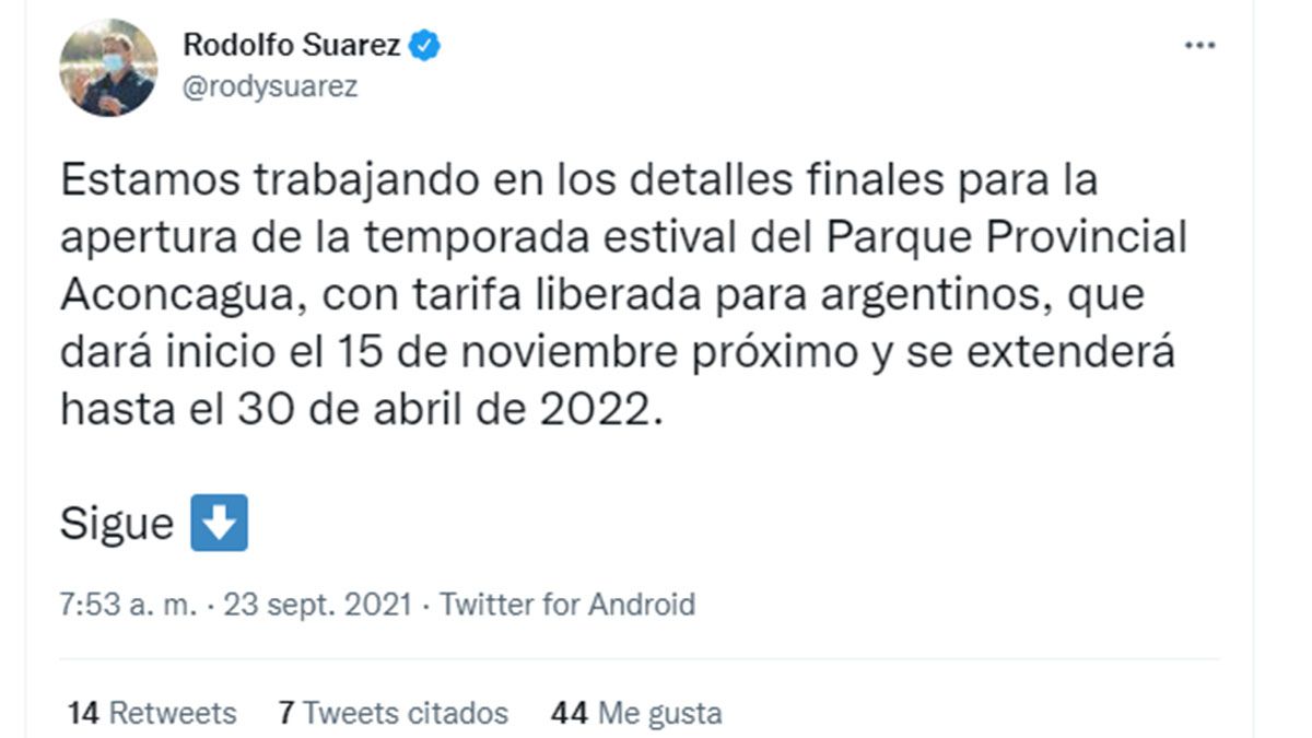 El gobernador Rodolfo Suarez anunció algunos de los detalles para la apertura de la temporada estival del Parque Provincial Aconcagua. Lo hizo este jueves a través de las redes sociales.