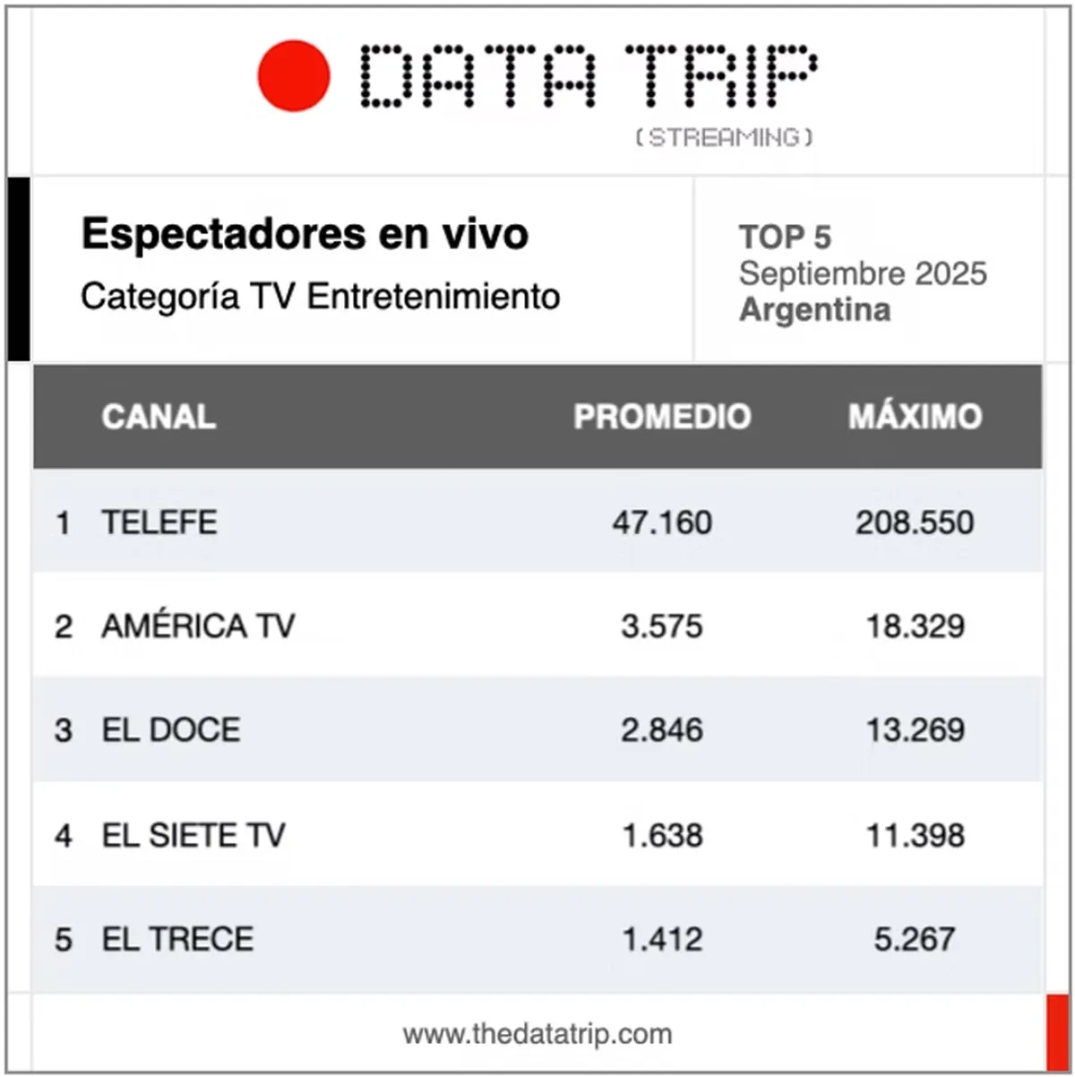 Los datos del último mes analizado, septiembre, revelan algunas tendencias claras y "otras sorpresas", anticiparon desde Data Trip al compartir el Top 10 global de canales con mayor promedio de espectadores en vivo, así como los rankings por categoría: streaming, entretenimiento, noticias, radios, prensa y deportes.