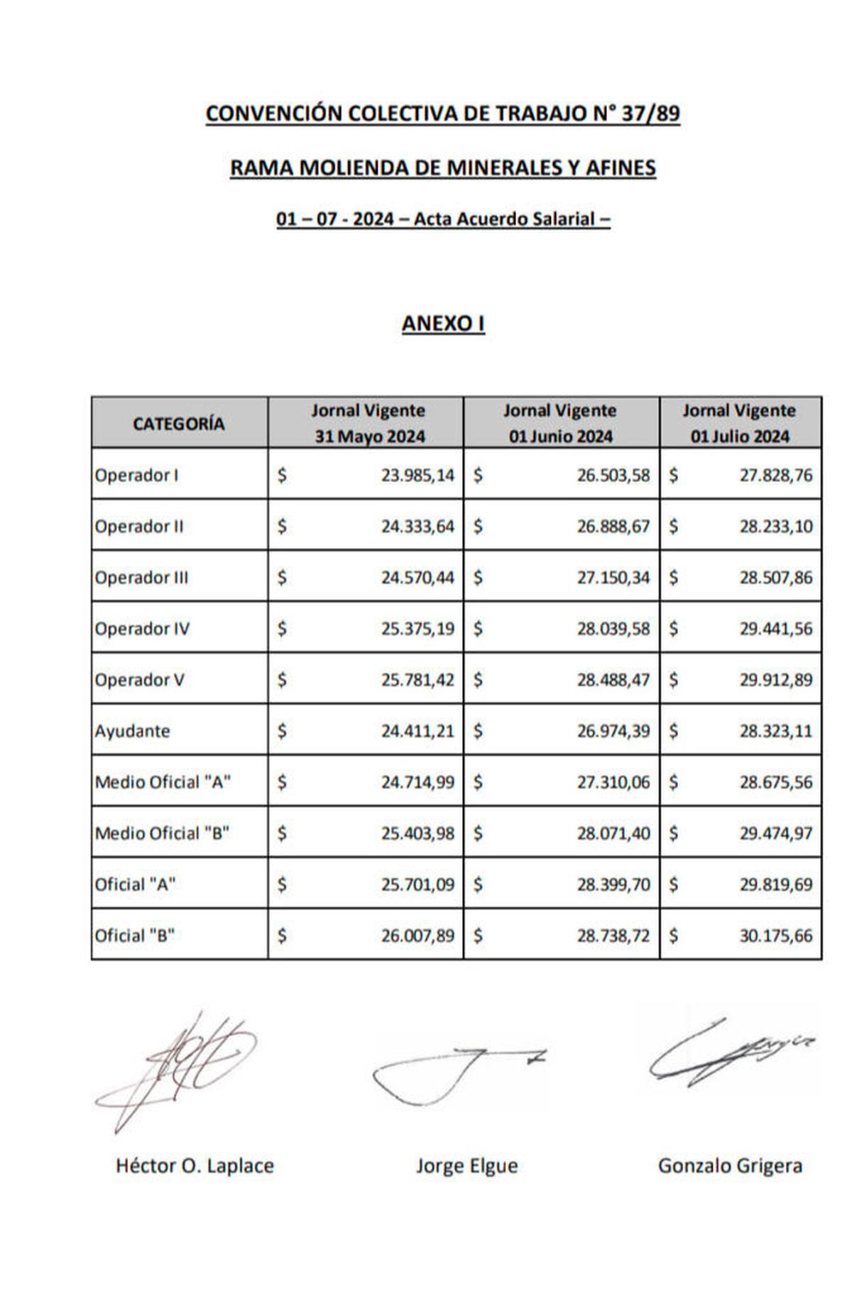 Los trabajadores afiliados a la Asociación Obrera Minera Argentina (AOMA) llegó a un acuerdo con la cámara empresaria de molienda de minerales y afines, dentro del convenio colectivo de trabajo (CCT) 37/89, para un aumento de sueldo bimestral con carácter acumulativo en los dos casos.