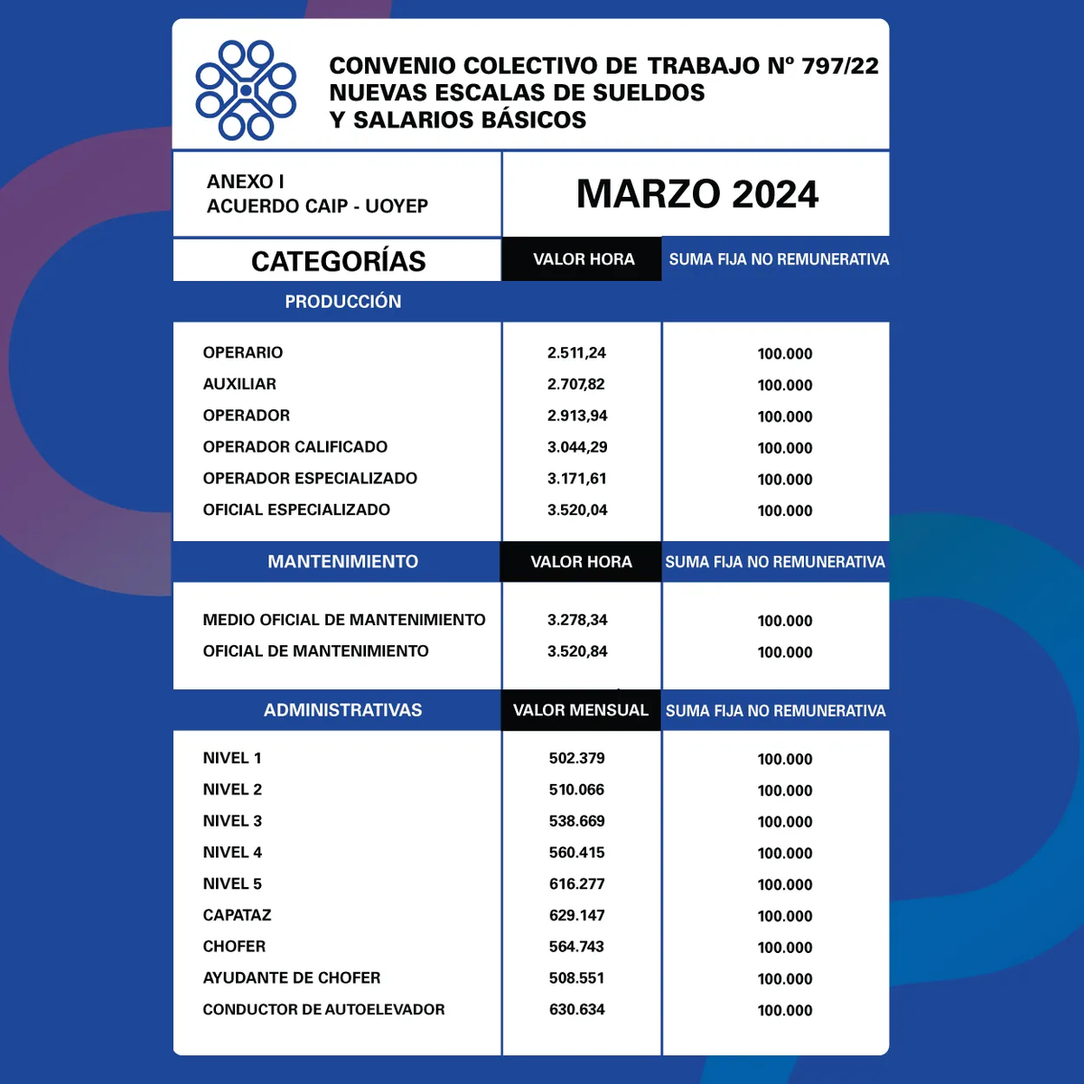 En tanto, en lo que tiene que ver con sueldos mensuales para tareas administrativas, un trabajador nivel 1 va a cobrar un salario de $502.379, mientras que uno de nivel 5 tendrá de básico $616.277.
