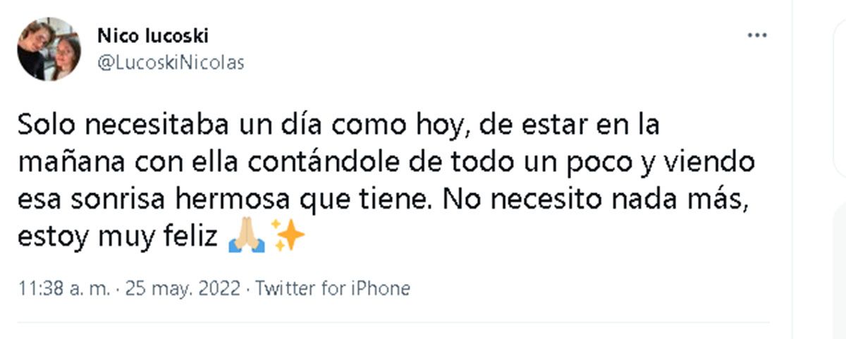 Nicolás Lucoski, hermano de Giuliana, posteó este miércoles en su cuenta de Twitter que pudo compartir tiempo con ella, contarle algunas cosas y disfrutar de los avances en la salud de la ex reina de la Vendimia.