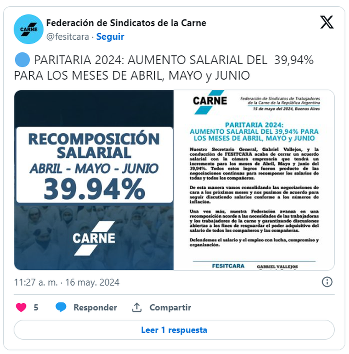 La Federación de Sindicatos de Trabajadores de la Carne (FESITCARA), que conduce Gabriel Vallejos, anunció en sus redes sociales el acuerdo alcanzado con la cámara empresaria para recomponer los salarios en un 39,94%.
