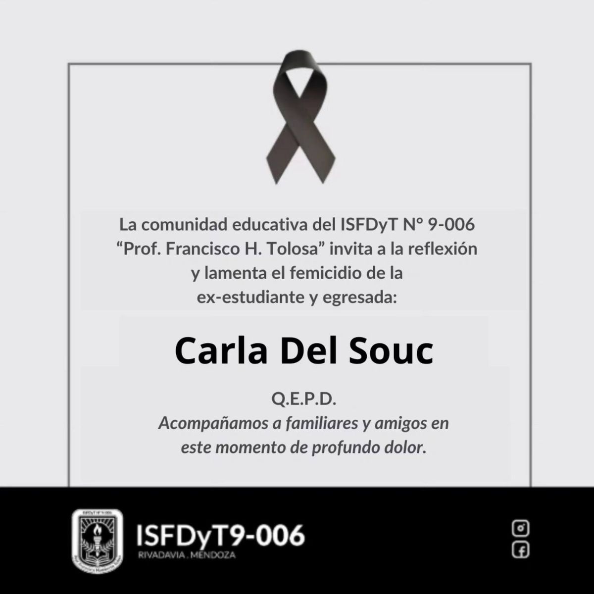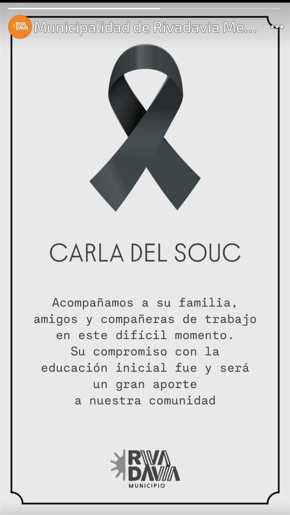 La Municipalidad de Rivadavia emitió un comunicado en señal de luto por el femicidio de Carla Janet Del Souc: "Acompañamos a su familia, amigos y compañeras de trabajo en este difícil momento. Su compromiso con la educación inicial fue y será un gran aporte a nuestra comunidad".