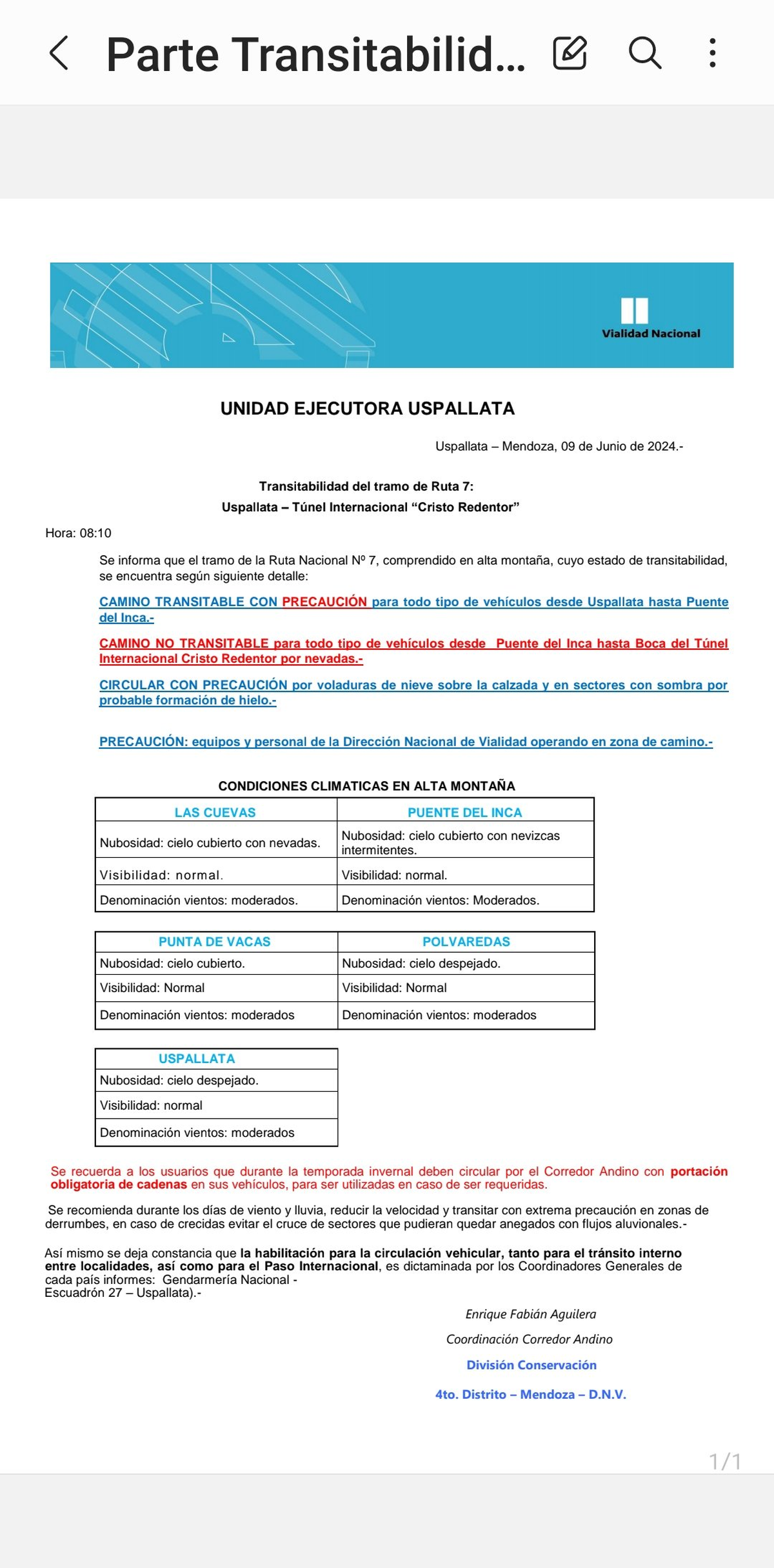 Desde Puente del Inca hasta Las Cuevas la Ruta Nacional 7 está intransitable por las nevadas. Sí se puede circular, con precaución, entre Uspallata y Puente del Inca, para todo tipo de vehículos. Se recomienda estar atentos a voladuras de nieve y sectores con sombra por porbable formación de hielo.