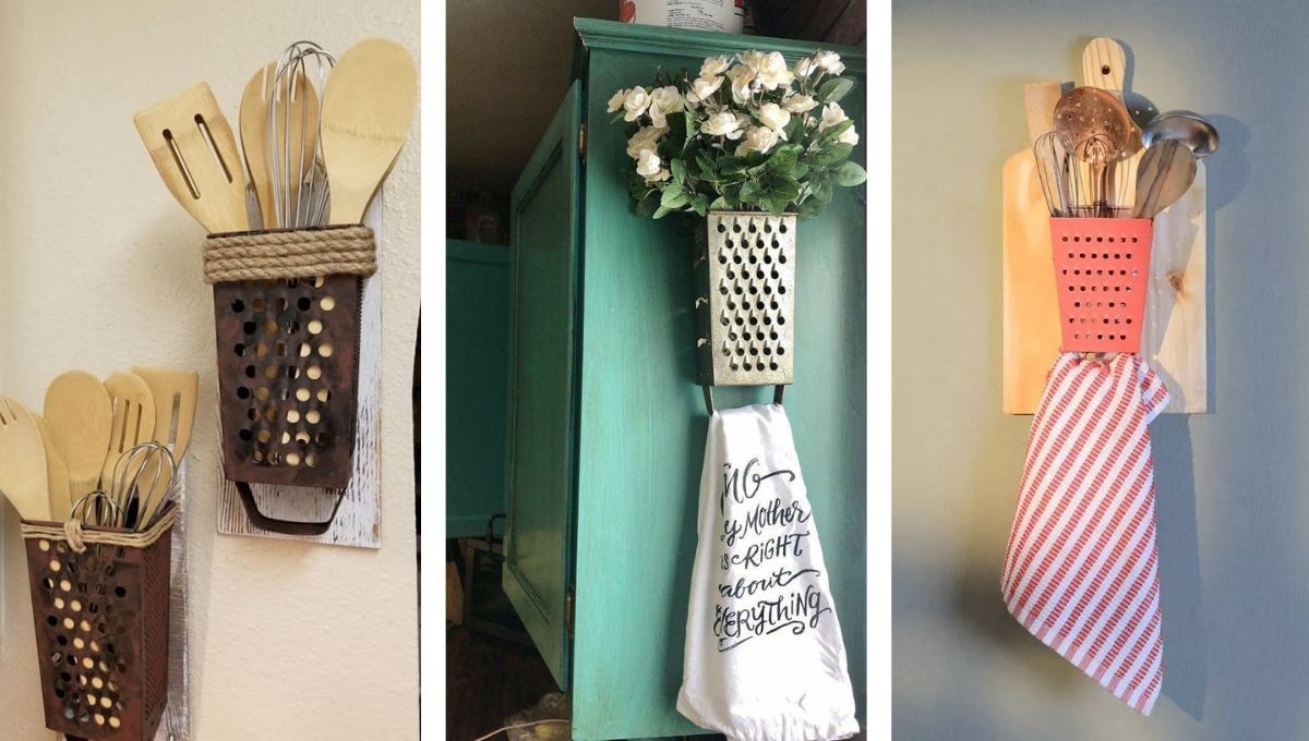 - Porta trapos de cocina: aprovecha el mango del rallador o añade un gancho para colgar paños, combinando funcionalidad con una decoración original.
