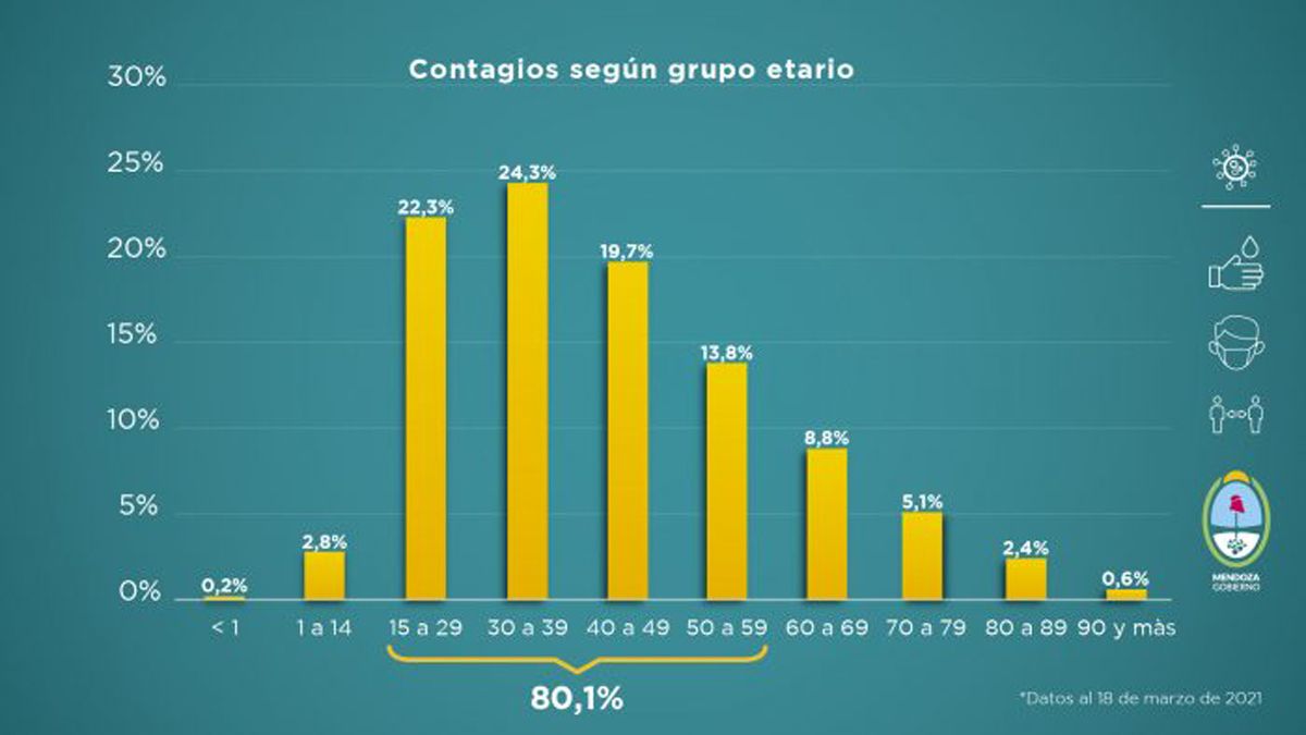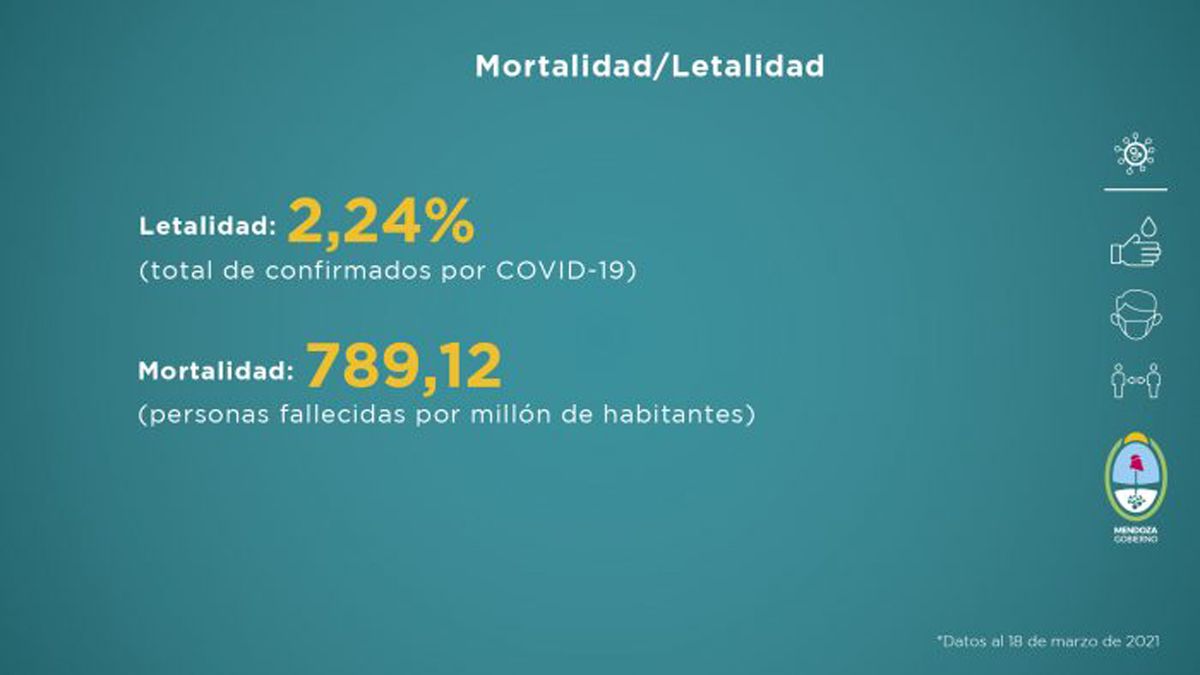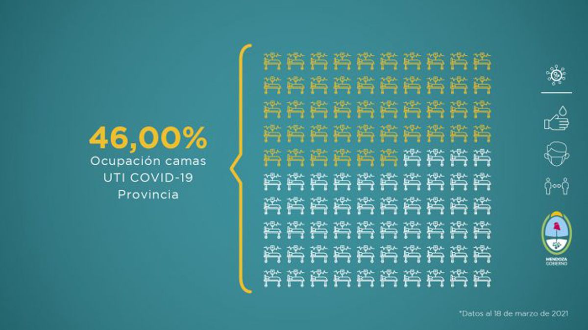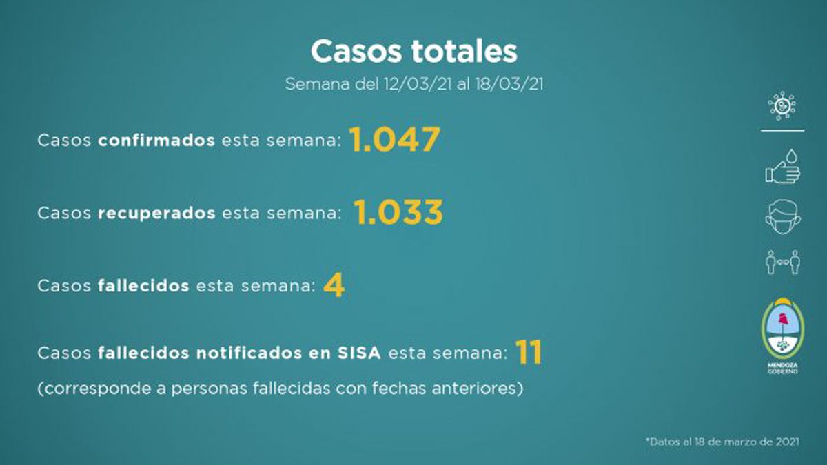 Como todos los viernes, el Gobierno de Mendoza informa la situación sanitaria de la provincia, ante la pandemia de la Covid-19. Este nuevo reporte fue elaborado teniendo en cuenta distintas variables que se evalúan a la hora de tomar medidas en función del avance de la enfermedad. Esta entrega comprende datos recopilados de la semana del 12 al 18 de marzo de 2021.