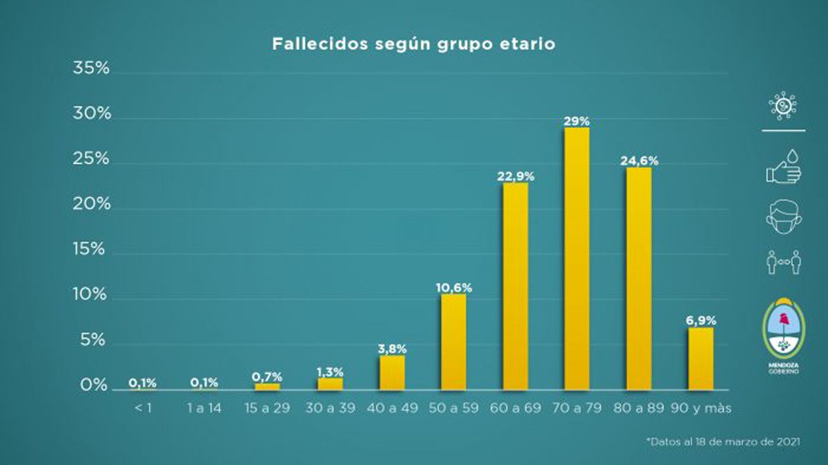 Asimismo, el grupo etario más vulnerable frente a la enfermedad sigue siendo el de los adultos mayores. El 76,5% de los fallecidos tiene entre 60 y 89 años y las personas de más de 90 años representan el 6,9%.