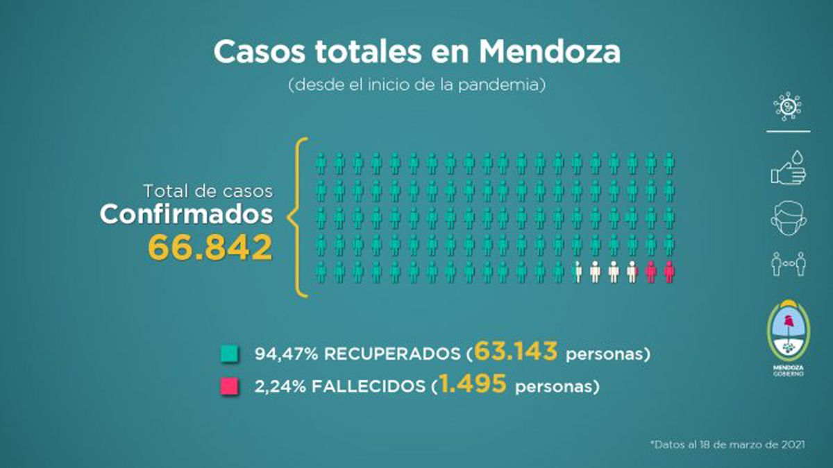 Los primeros datos que se desprenden desde que comenzó la pandemia en Mendoza fueron hasta el jueves: 66.842 confirmados, 63.143 recuperados y 1.495 fallecidos.