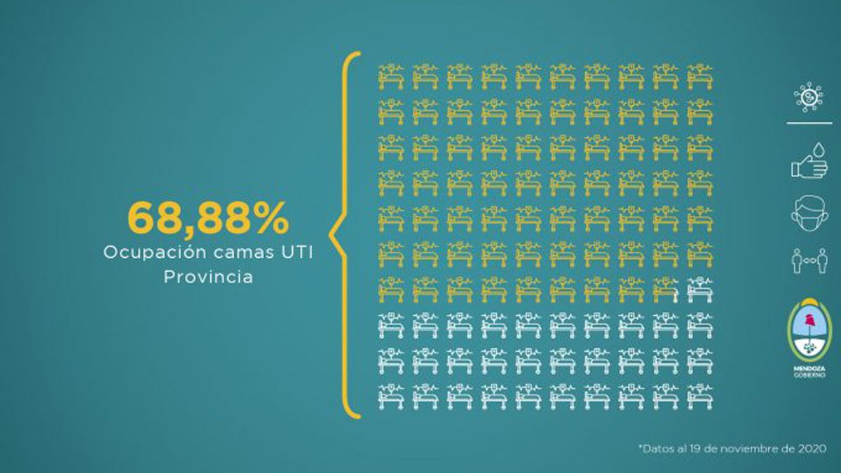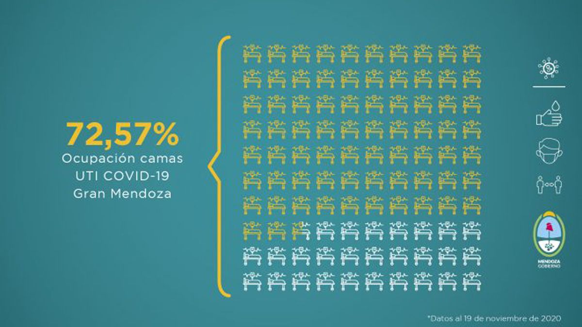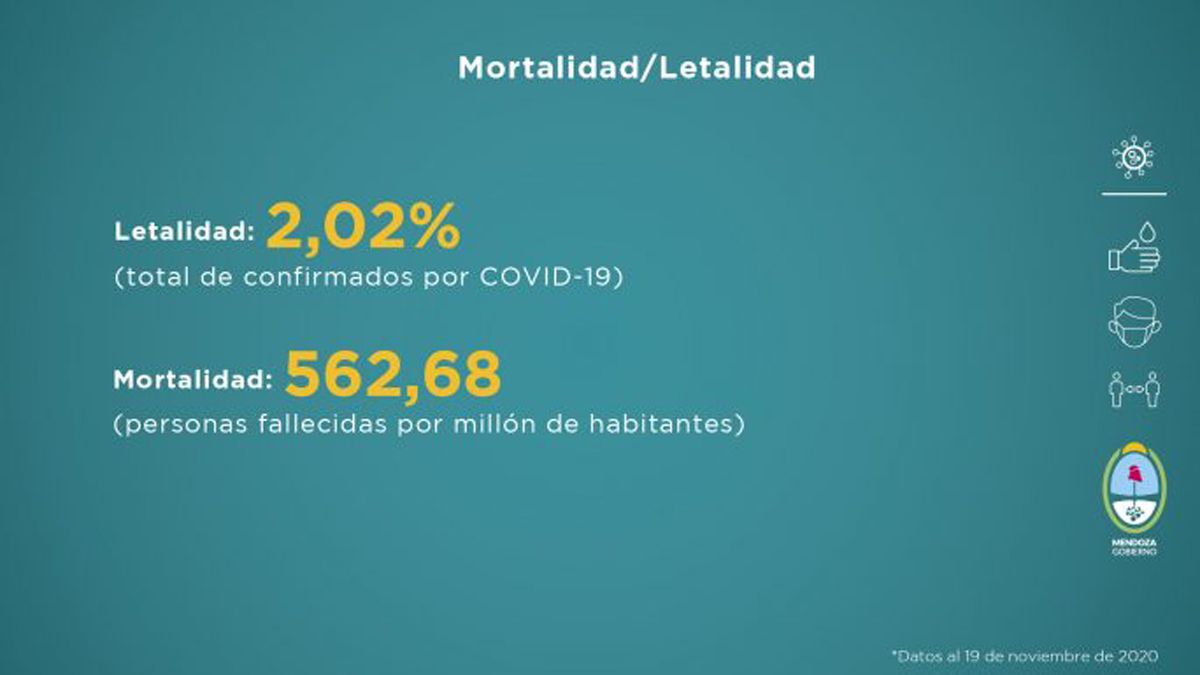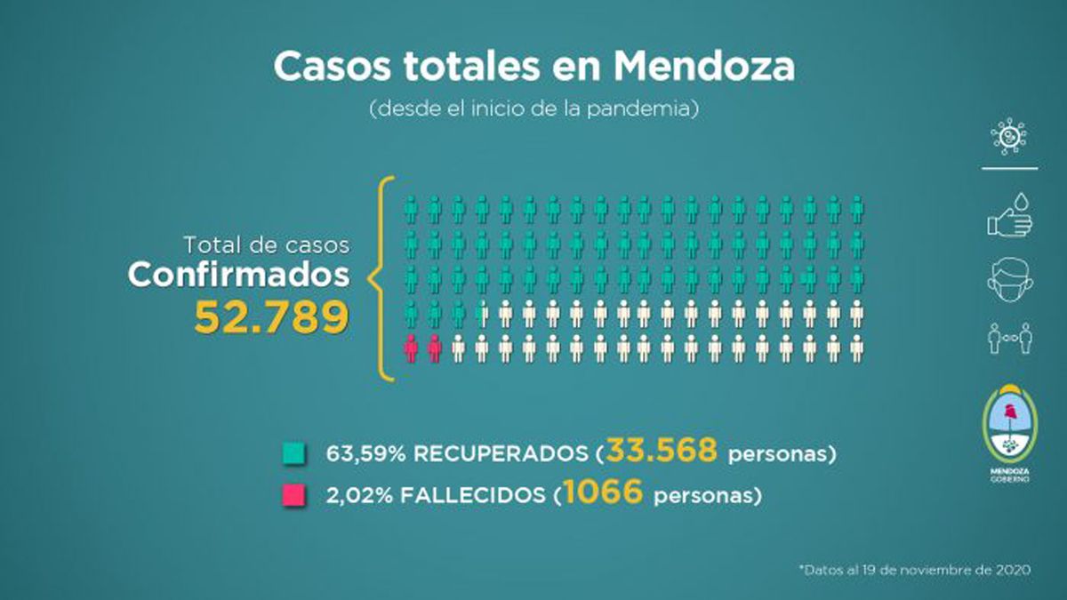 El Gobierno de Mendoza informó este viernes por la tarde la situación sanitaria de la provincia, ante la pandemia del Covid-19. Este nuevo informe fue elaborado teniendo en cuenta distintas variables que se evalúan a la hora de tomar medidas en función del avance de la enfermedad. Esta entrega comprende datos recopilados de la semana del 12 al 19 de noviembre de 2020. Los primeros datos que se desprenden desde que comenzó la pandemia en Mendoza son hasta el jueves a la noche a las 21.15. Allí se consigna que hay: 52.789 confirmados, 33.568 recuperados y 1.066 fallecidos.