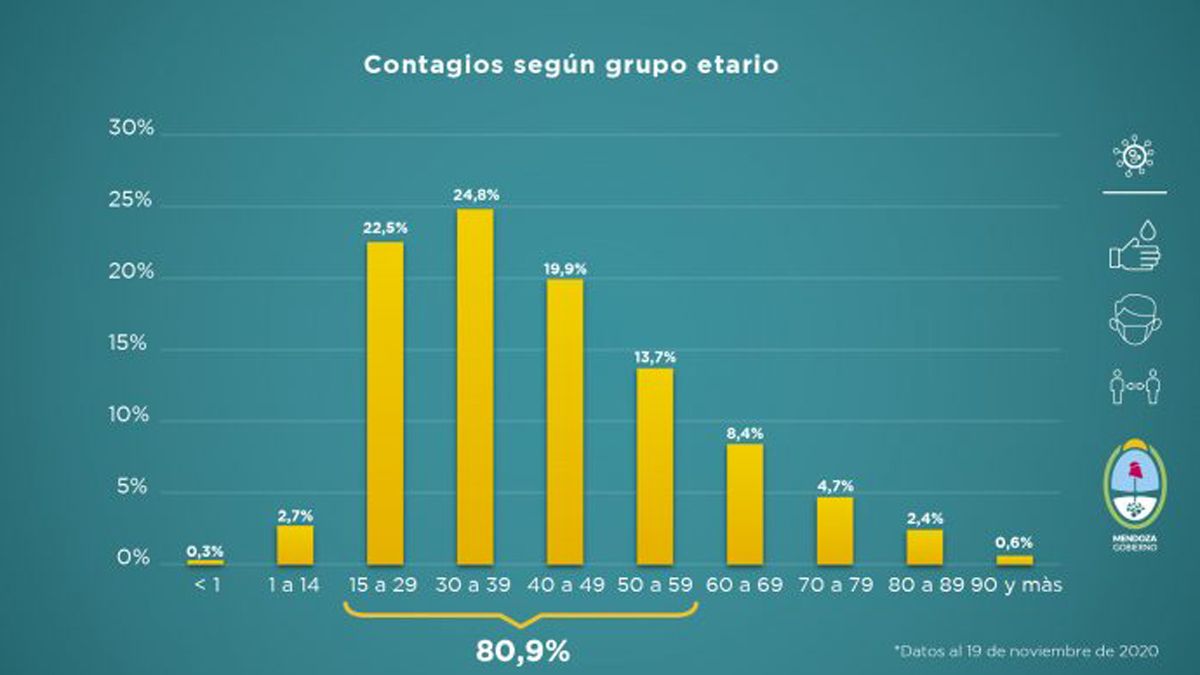De los datos oficiales también surge que en la franja etaria de los 15 a los 59 años, es donde más contagios se producen y también donde se da el mayor porcentaje de recuperación. Sigue manteniéndose en el 80,9% de los infectados.