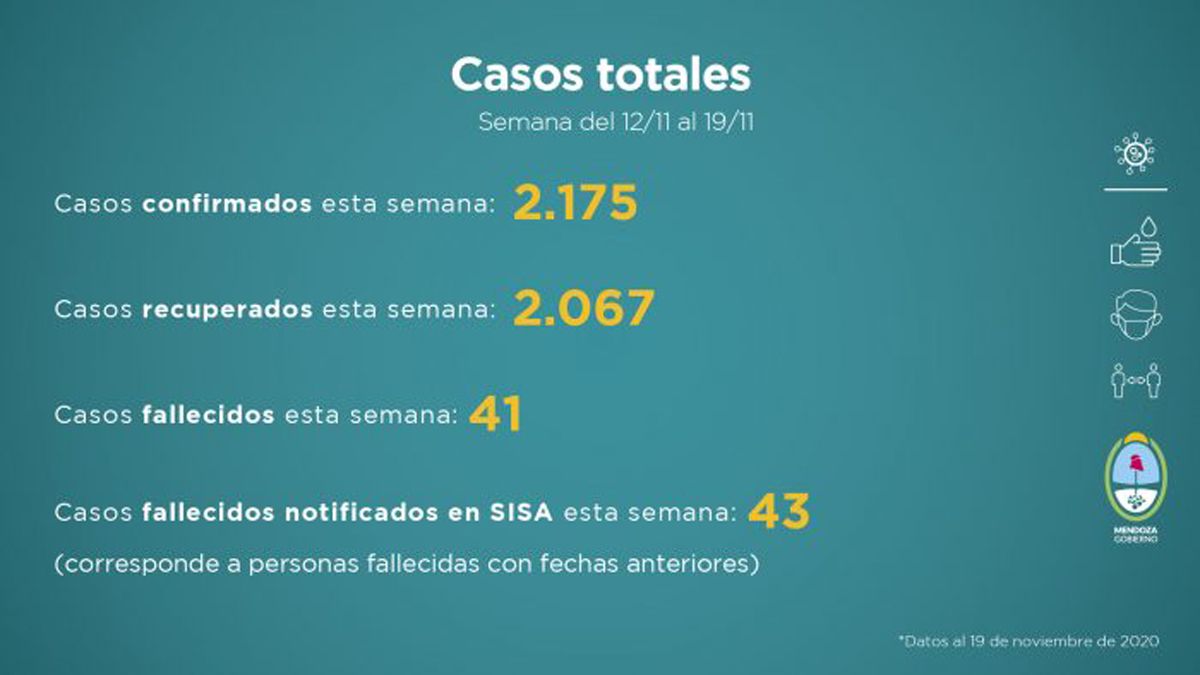 En cuanto a la cantidad de casos de COVID-19 en la semana del 12 al 19 de noviembre de 2020, a las 21.15, es de 2.175 confirmados, 2.067 recuperados, 41 fallecidos y 43 casos fallecidos notificados en SISA esta semana (corresponde a personas fallecidas con fechas anteriores).