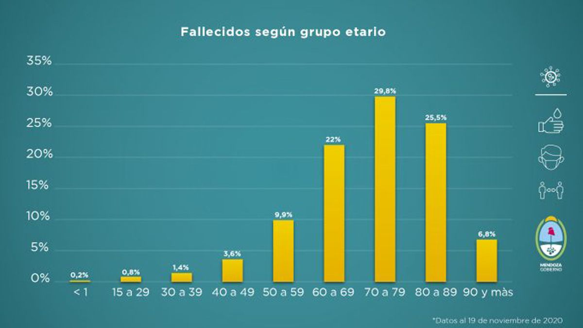Asimismo, el grupo etario más vulnerable frente a la enfermedad sigue siendo el de los adultos mayores. El 77,3% de los fallecidos tiene entre 60 años y 89 años y las personas de más de 90 años representa el 6,8%.