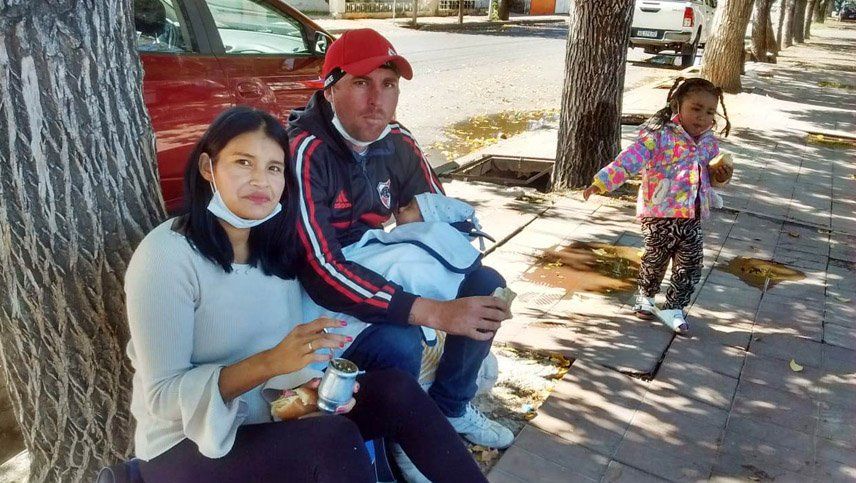 “Somos de Salta y llegamos como hace unos 5 meses”, dice Gladys, mientras ceba el mate y su marido tiene alzado a uno de sus bebés. “Somos 10, con 5 niños”, cuenta. “Estamos esperando que nos den el permiso para irnos, pero no sabemos cuándo”.