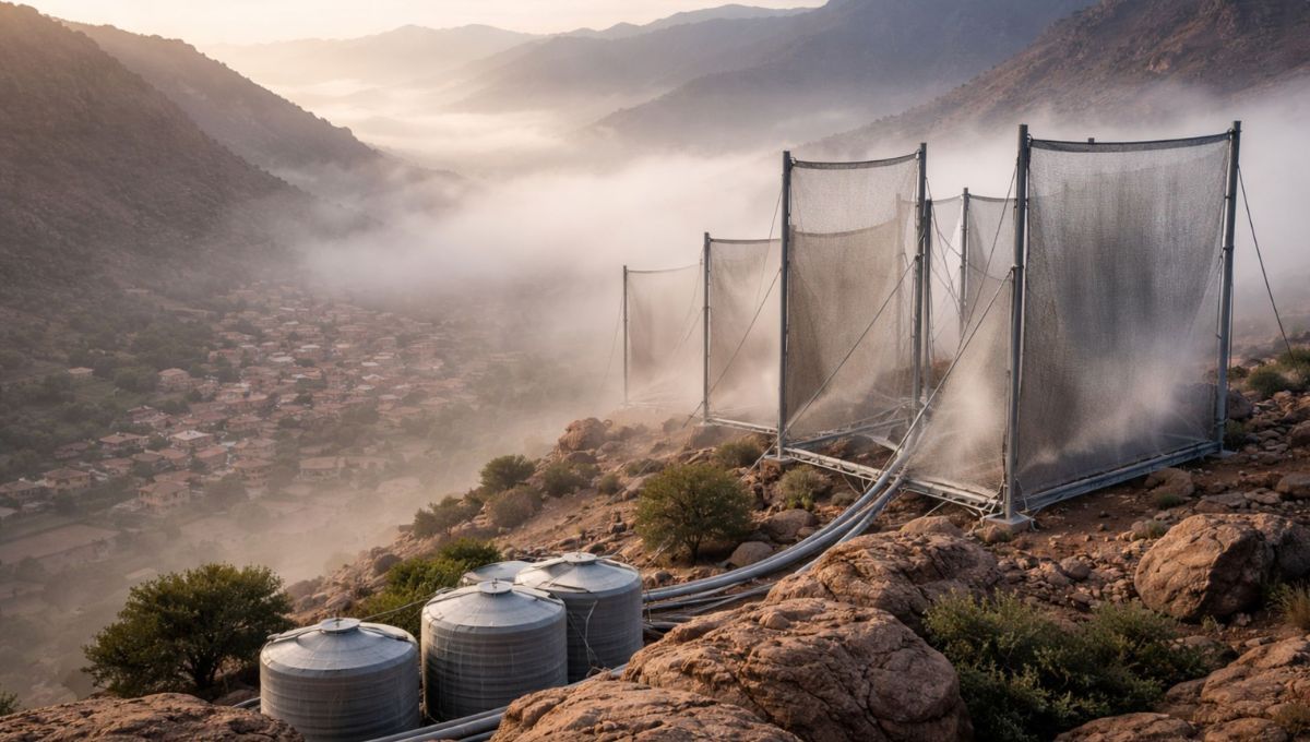 - En Marruecos, cerca del desierto del Sahara, ya hay más de 1.600 m² de mallas instaladas, conectadas a tanques y tuberías que llevan agua potable directamente a las casas.
