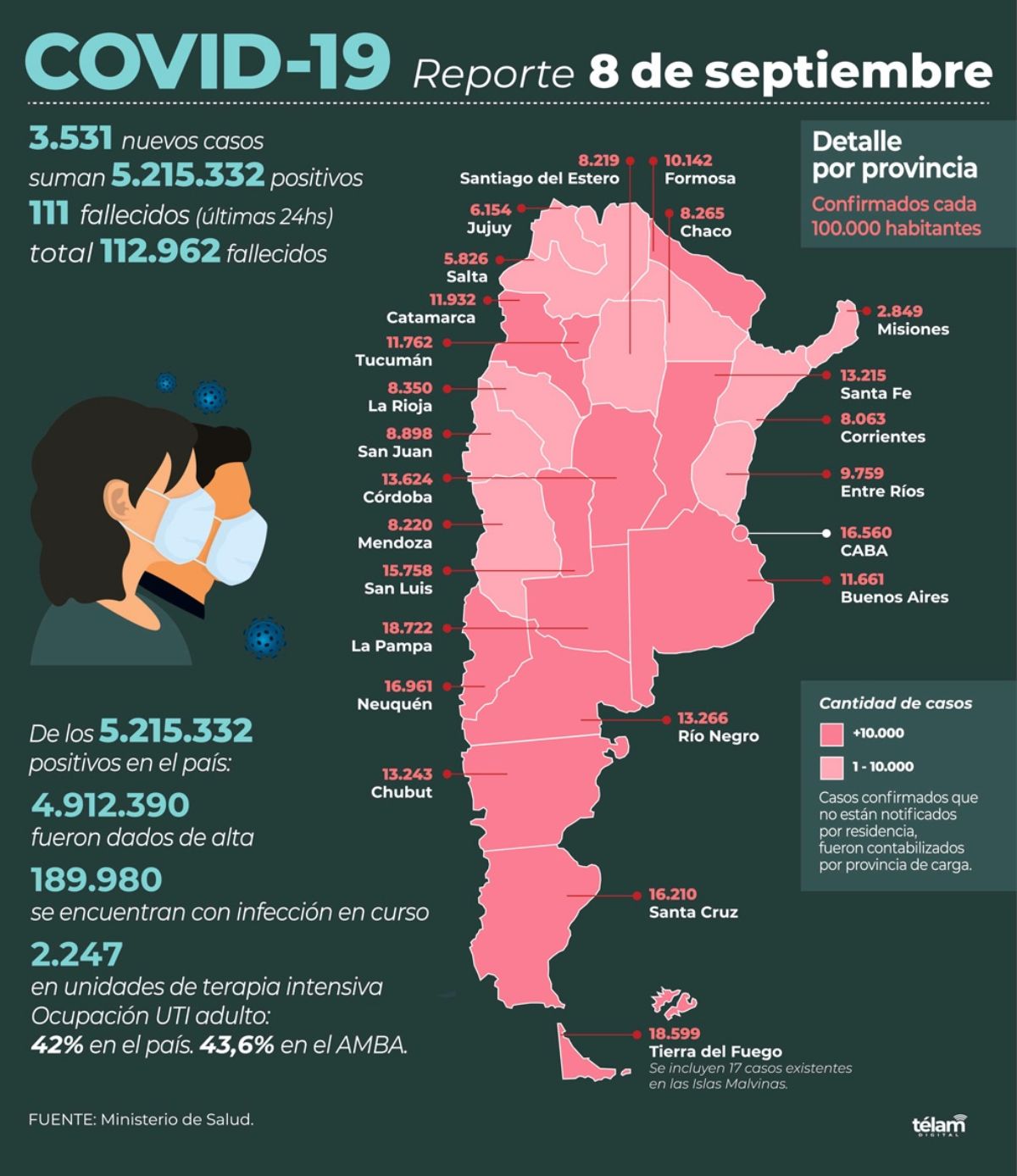 De los 5.215.332 contagiados, el 94,19% (4.912.390) recibió el alta y 189.980 son casos confirmados activos.