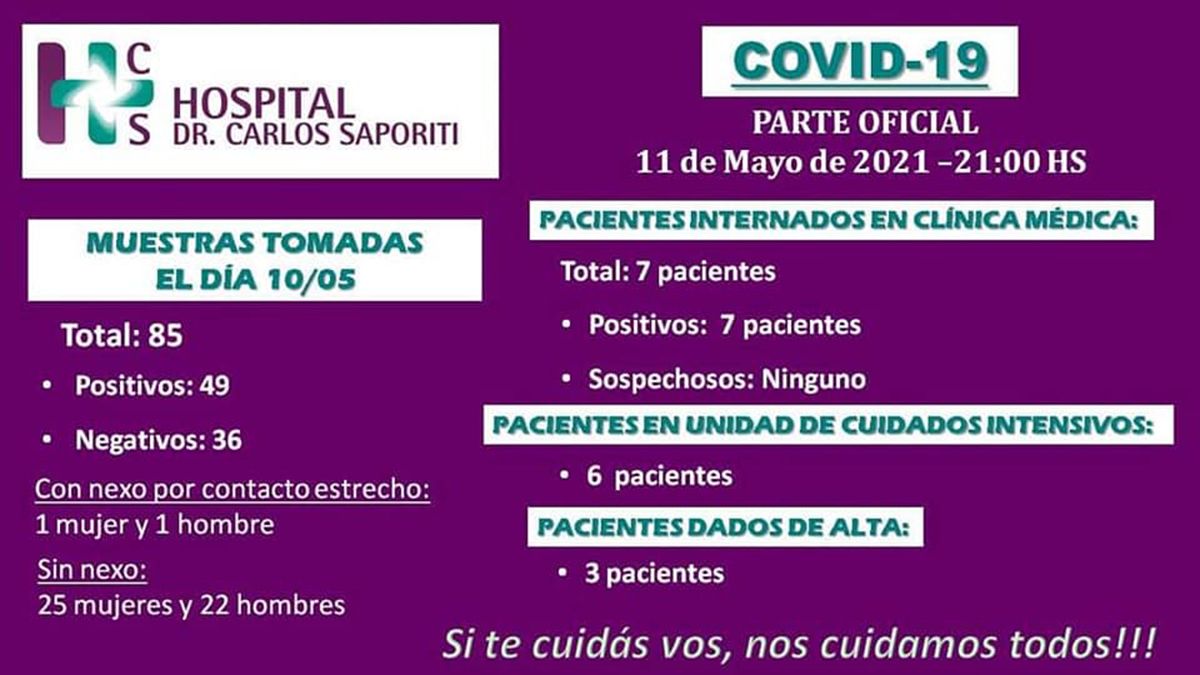 Pero los números en el Hospital Humberto Saporiti, de Rivadavia, fueron aún más preocupantes. De un total de 85 testeos, 49 resultaron positivos a Covid-19 y solo 36 fueron negativos, con el agravante de que solo dos casos fueron dados como positivos por contacto estrecho.