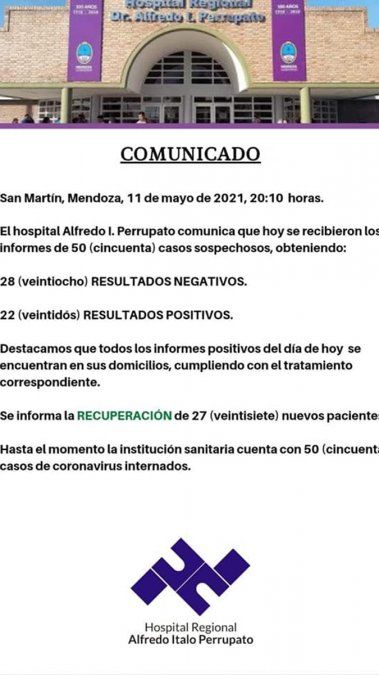 En el Hospital Alfredo Ítalo Perrupato, en San Martín, de un total de 50 casos sospechosos, 22 resultaron positivos. Además se informó que hay 50 pacientes internados, una cifra por demás superior a lo que venía sucediendo hasta ahora, en donde apenas se superaban los 40 en días complejos.