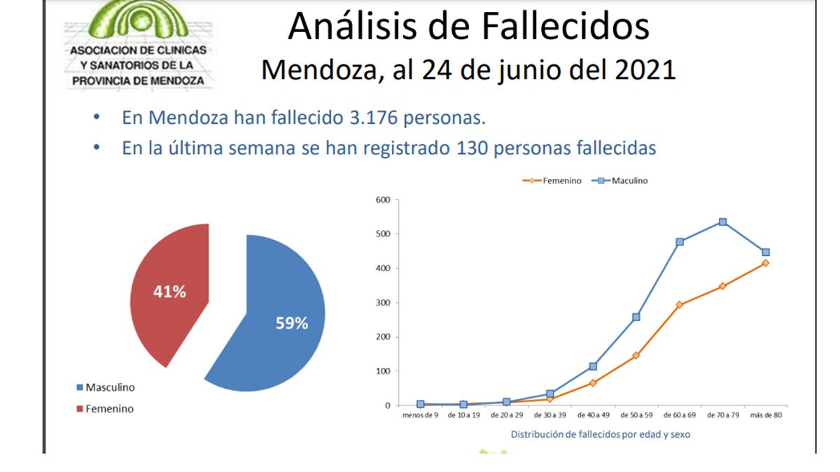 La última semana se registraron 130 muertes asociadas a Covid-19. En tanto, hasta el 24 de junio en Mendoza han fallecido 3.176 personas por esta causa. Seis de cada diez son varones, 28,89% tenia mas de 80 anos y 14,64% entre 70 y 79 anos.