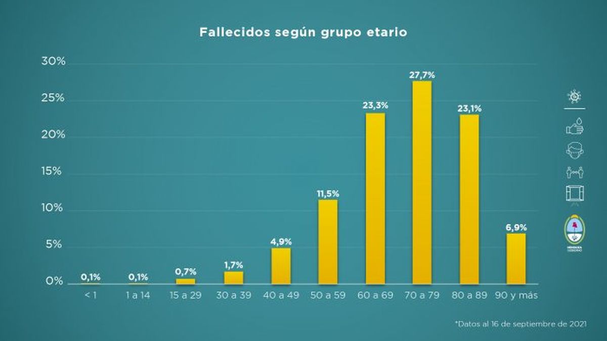 Asimismo, el grupo etario más vulnerable frente a la enfermedad sigue siendo el de los adultos mayores. El 74,1% de los fallecidos tiene entre 60 años y 89 años y las personas de más de 90 años representan el 6,9%.