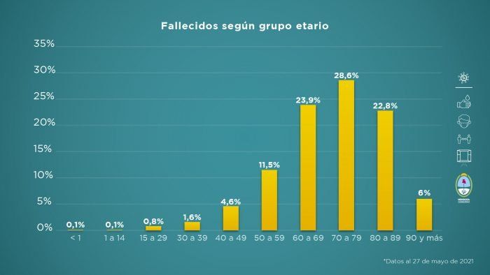 Asimismo, el grupo etario más vulnerable frente a la enfermedad sigue siendo el de los adultos mayores. El 75,3% de los fallecidos tiene entre 60 años y 89 años y las personas de más de 90 años representa el 6%.