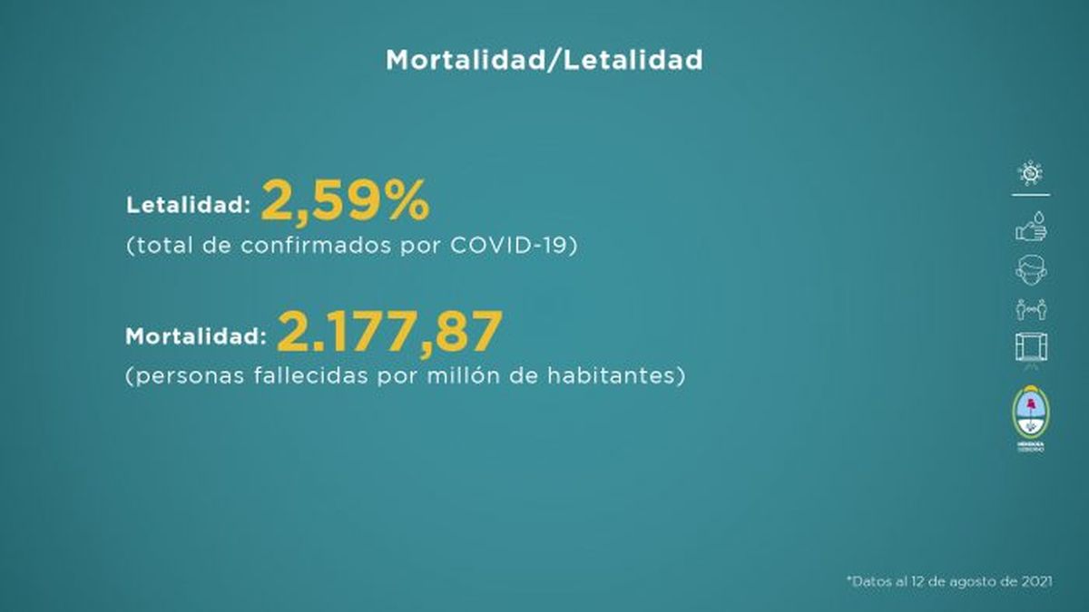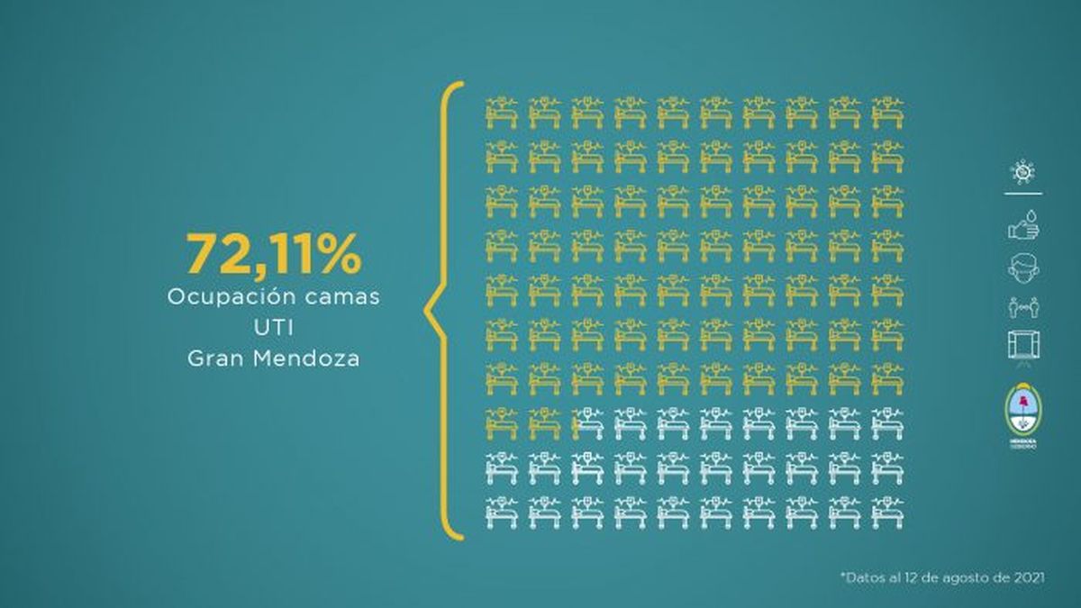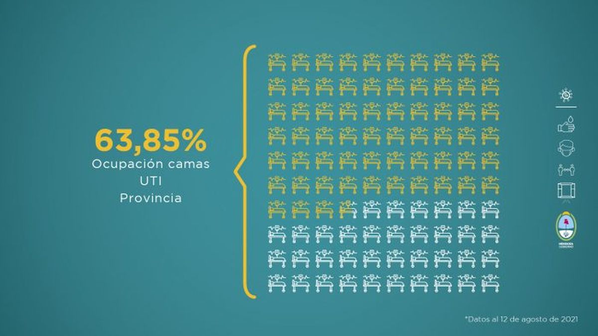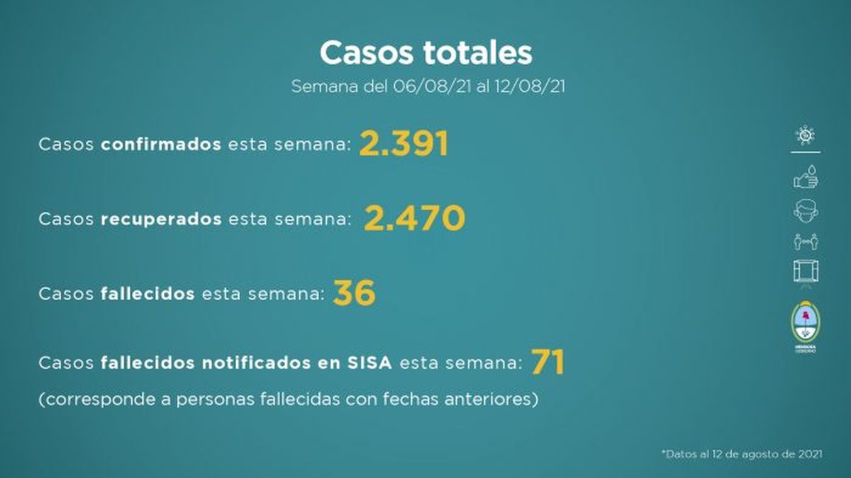 Como sucede durante toda la pandemia, el Gobierno de Mendoza comunica la situación sanitaria de la provincia. Este nuevo reporte fue elaborado teniendo en cuenta distintas variables que se evalúan a la hora de tomar medidas en función del avance de la enfermedad. Esta entrega comprende datos recopilados de la semana del 6 al 12 de agosto.