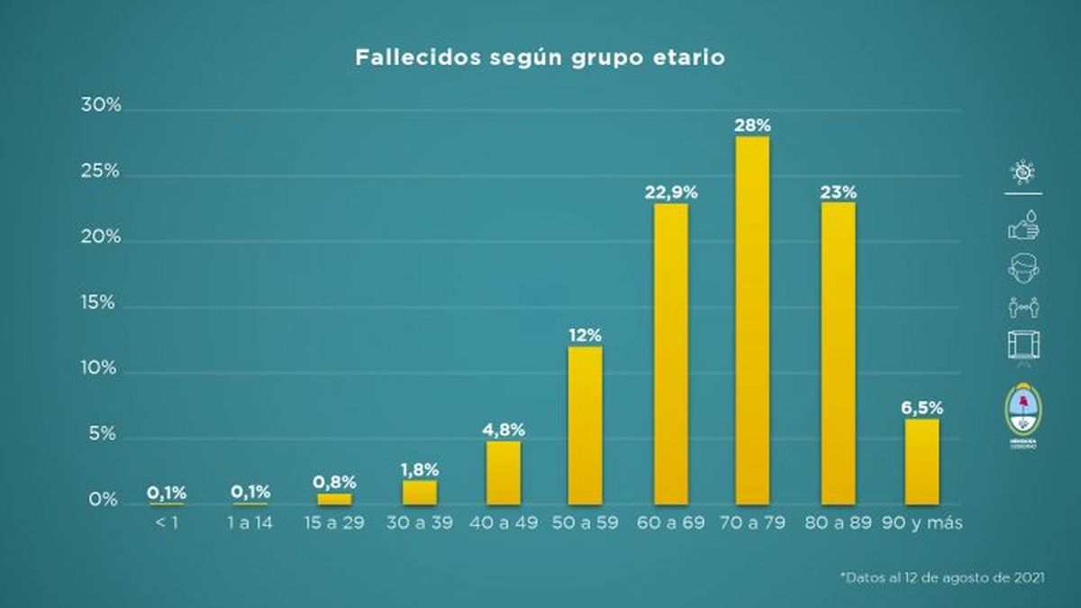 Asimismo, el grupo etario más vulnerable frente a la enfermedad sigue siendo el de los adultos mayores. El 73,9% de los fallecidos tiene entre 60 años y 89 años y las personas de más de 90 años representan el 6,5%.