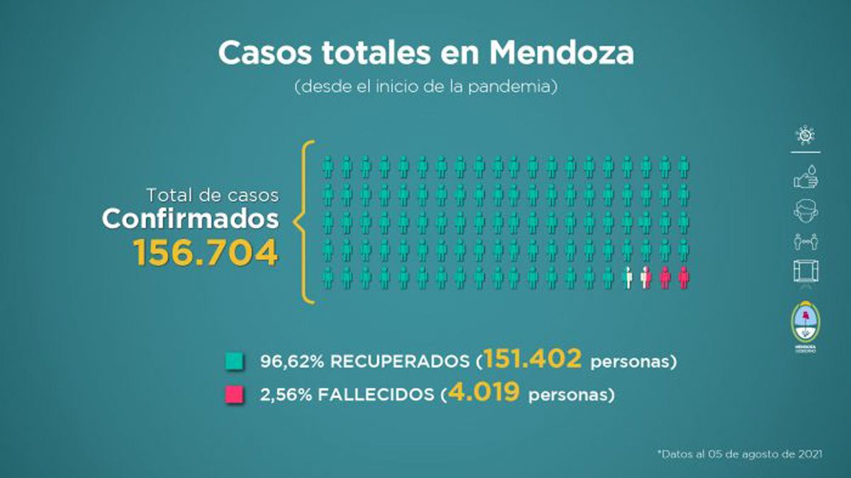 Los primeros datos que se desprenden desde que comenzó la pandemia en Mendoza son hasta el jueves a la noche: 156.704 confirmados, 151.402 recuperados y 4.019 fallecidos.