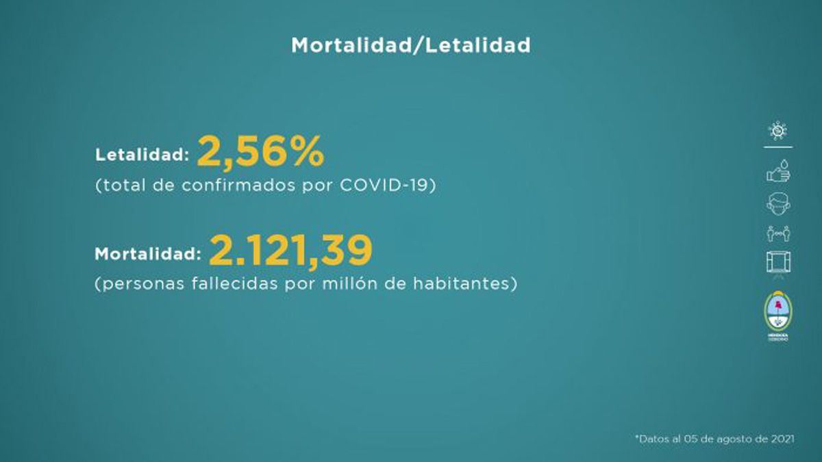 Al observar el porcentaje de fallecidos según el grupo etario, Mendoza cuenta con una Mortalidad de 2.121,39 por millón de habitantes y de Letalidad 2,56 por total de confirmados por Covid-19.
