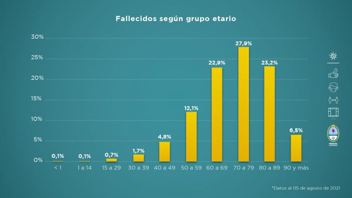Asimismo, el grupo etario más vulnerable frente a la enfermedad sigue siendo el de los adultos mayores. El 74% de los fallecidos tiene entre 60 años y 89 años y las personas de más de 90 años representan el 6,5%.