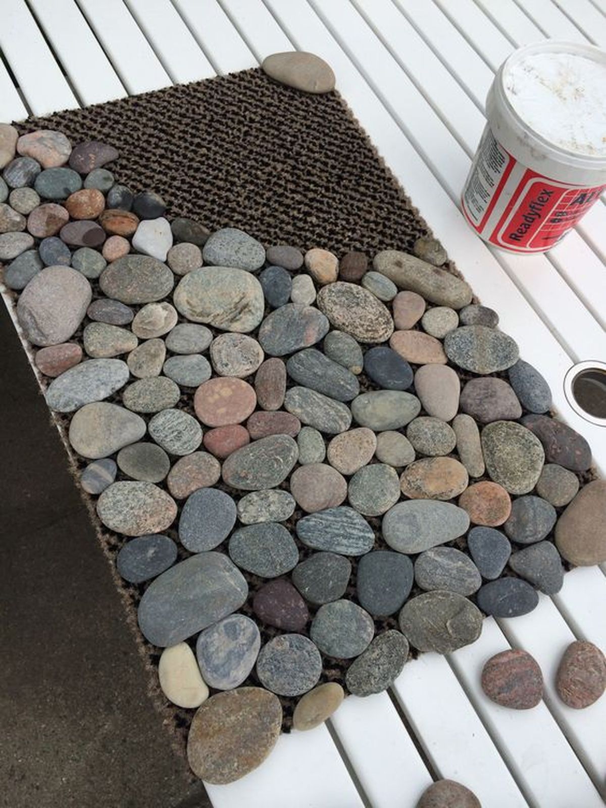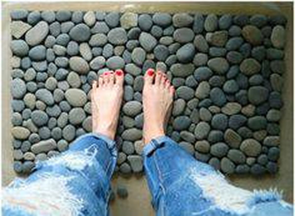Toma la plancha de esterilla del tamaño y forma que quieras que sea la alfombra, puede ser rectangular o circular. Luego toma todas las piedras chatas necesarias para cubrir toda la superficie de la alfombra y comiénzalas a pegar una por una al lado de la otra.