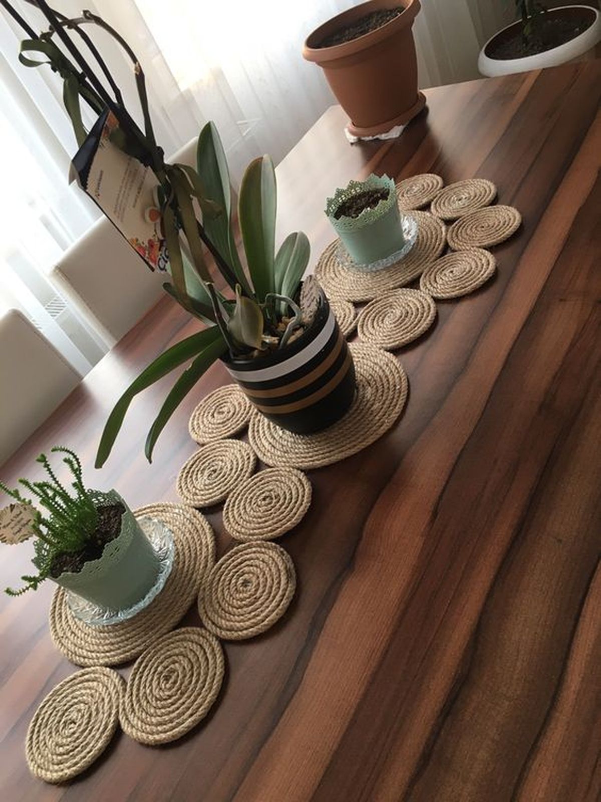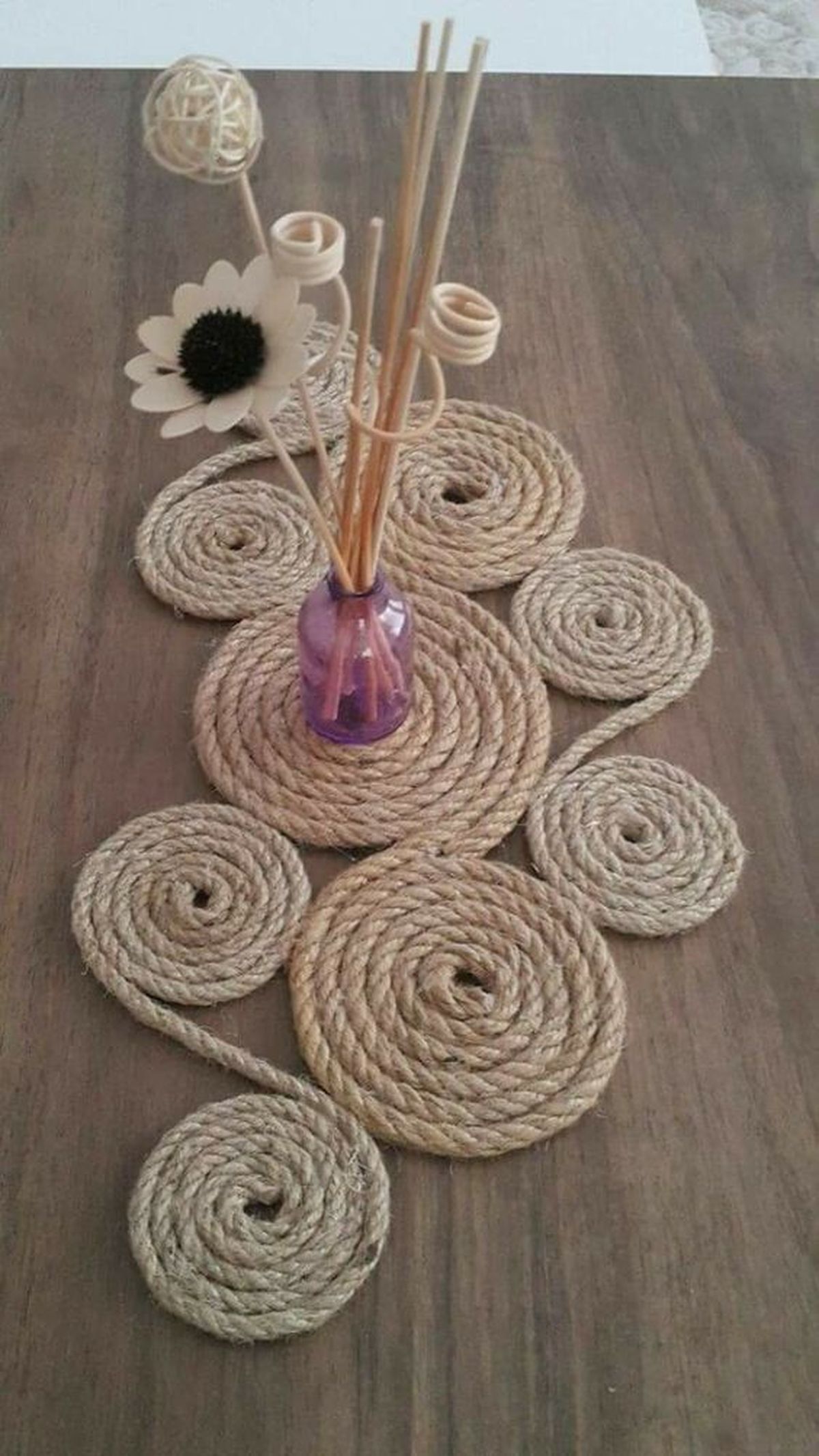 Luego para comenzar con el próximo círculo si quieres puedes cortar el hilo de yute y hacerlos todos por separados y luego unirlos o bien puedes continuarlos sin hacer cortes en el hilo, tal como se ve en la imagen. Si quieres puedes jugar con los tamaños de círculos y eso mismo le dará una forma muy original al camino de mesa que seguro les encantará a todos.