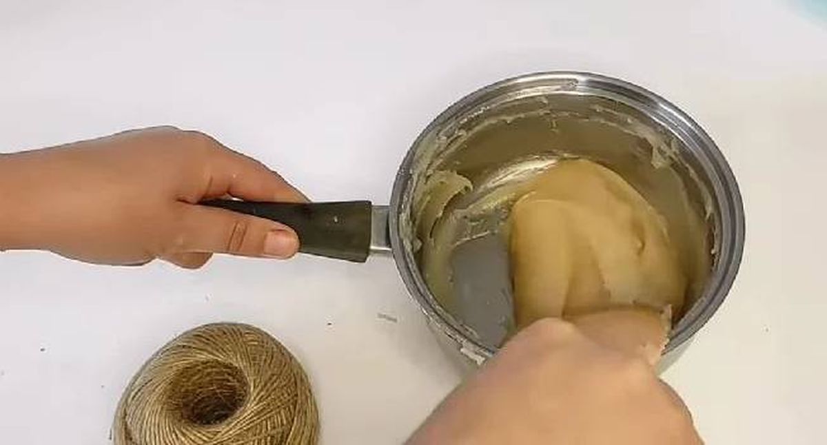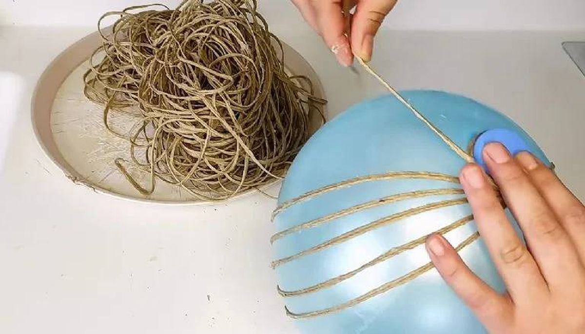 - Infla un globo, toma el hilo de arpillera y agrégales el pegamento para comenzar a unirlos, es decir, pegar el hilo sobre el globo.