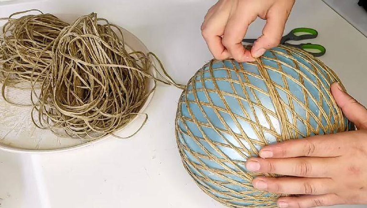 - En la parte superior del globo pon la tapa y sostenla con la mano, en la misma enrolla el hilo y luego comienza a envolver el globo con el hilo de arpillera.