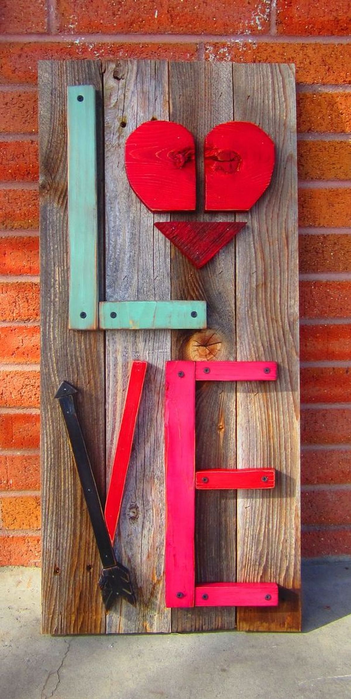 Luego con la ayuda de un serrucho comienza a darle forma a las piezas de madera que formarán el cuadro, ya sea que quieras formar un palabra, figuras o la combinación de ambas como aparece en la imagen. Después pinta cada pieza del color que desees, deja secar bien y luego clávalas en la tabla de madera de base.