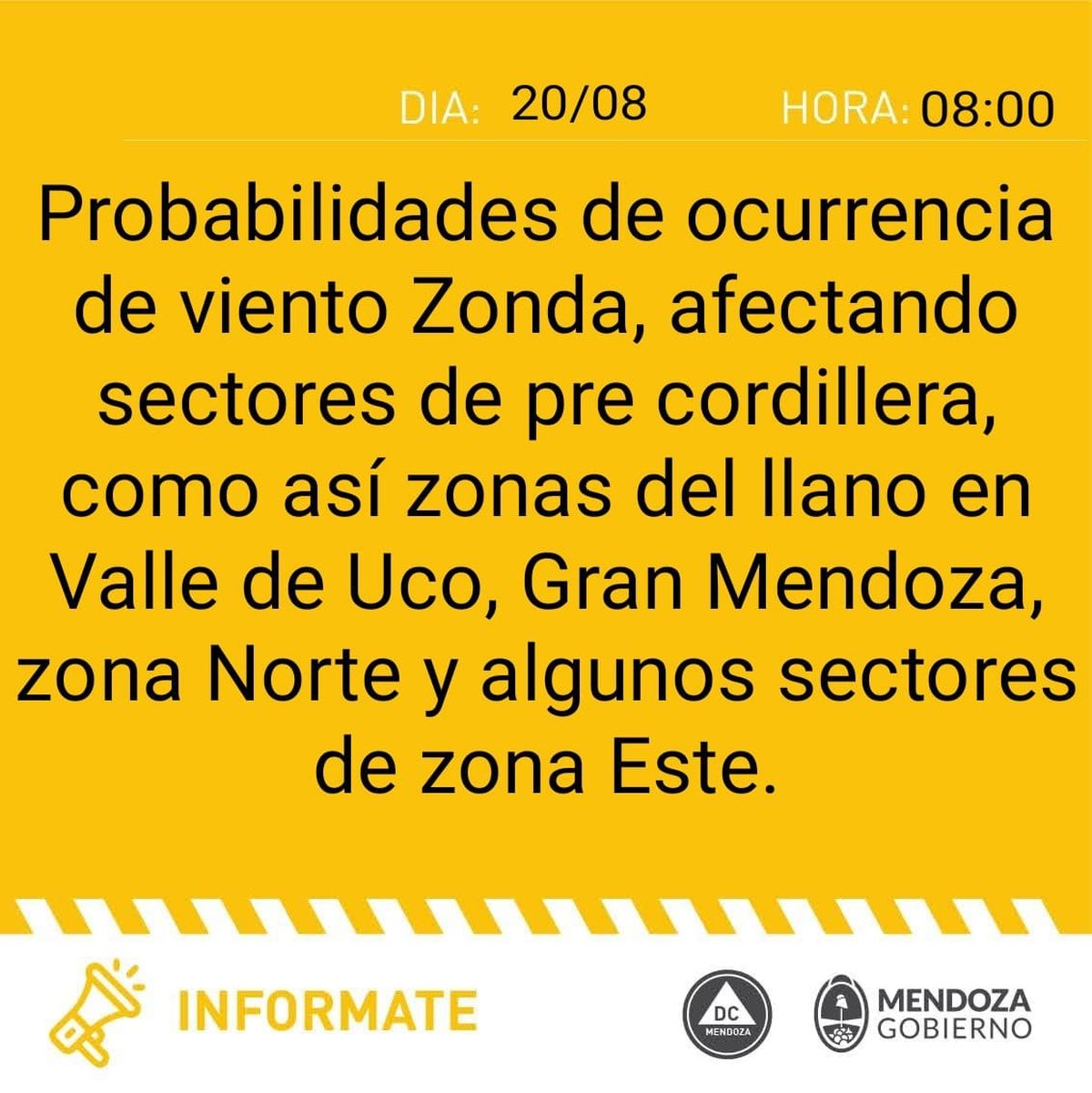 Más allá de que el Zonda está pronosticado para la zona precordillerana, hay posibilidades concretas de que baje al llano a partir de las primeras horas de la tarde de este domingo, provocando inestabilidad con aumento de la nubosidad y una temperatura máxima que podría superar los 20º.