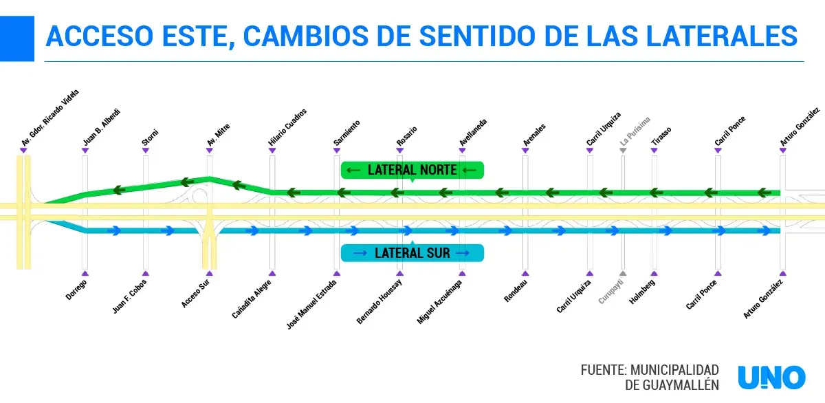 La fecha elegida para los cambios en las laterales del Acceso Este será el lunes 9 de febrero. La modificación abarca el tramo comprendido entre el Nudo Vial (Avenida Gobernador Videla) y la calle Arturo González, en el límite con el departamento de Maipú.