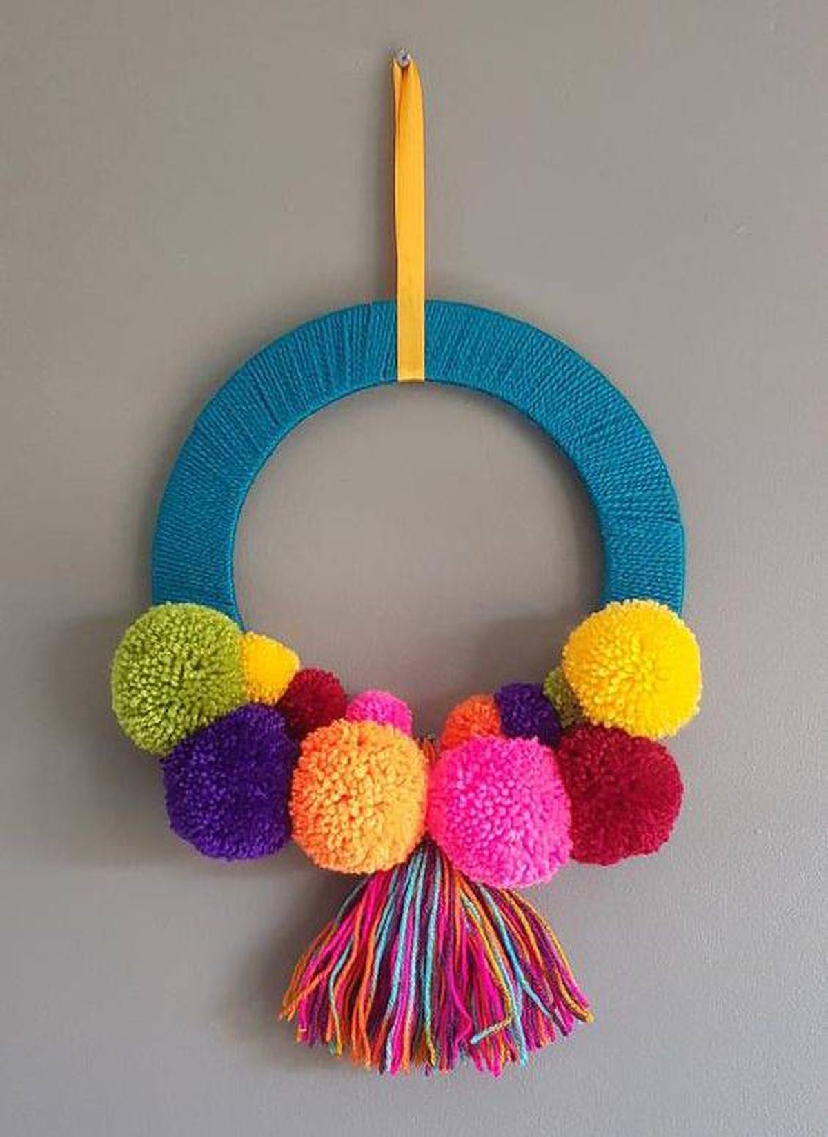 Después toma los pompones de distintos colores y tamaños y pégalos como se ven en la imagen. También puedes cortar varias tiritas de hilo de distintos colores y pegarlos en la parte inferior del aro para que queden como una especie de flecos.
