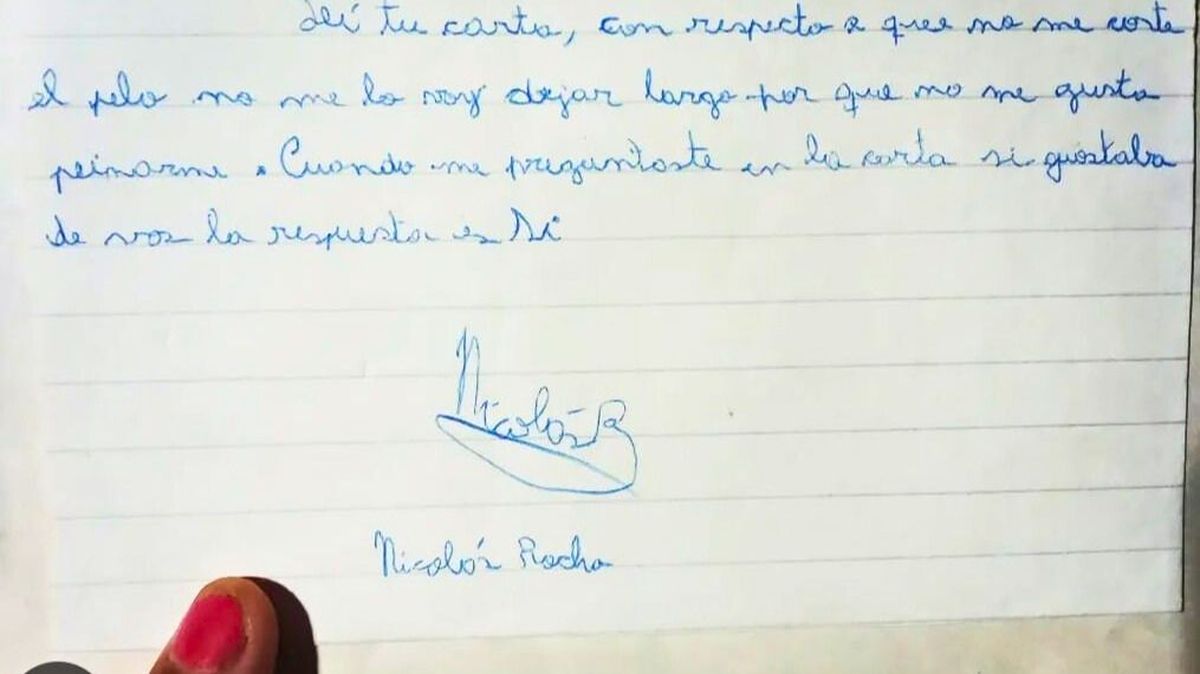 La carta que encontró la mujer decía con la inocencia de un niño: "Melody: leí tu carta, con respecto a que no me corte el pelo, no me lo voy a dejar largo porque no me gusta peinarme. Cuando me preguntaste en la carta si gustaba de vos, la respuesta es sí. Nicolás".