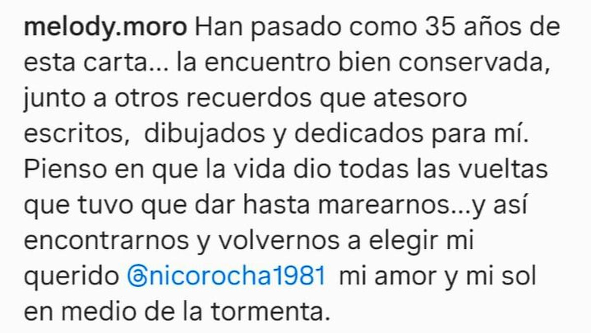 Al encontrarla, Melody no dudó en compartirla en sus redes: “Han pasado como 35 años de esta carta… la encuentro bien conservada junto a otros recuerdos que atesoro escritos, dibujados y dedicados a mí. Pienso en que la vida dio todas las vueltas que tuvo que dar hasta marearnos… y así encontrarnos y volvernos a elegir mi querido @nicorocha1981. Mi amor y mi sol en medio de mi tormenta. Recuerdo la mañana en que recibí la carta. Junto a un inocente y tierno regalo, un portaminas de esos que se le sacaba la punta por atrás con un osito verde agua, está su papel y su moño. Aprovecho a decirte que el pelo te queda divino como lo uses. Y qué bueno que te sigo gustando. Vos a mí también, marido”.