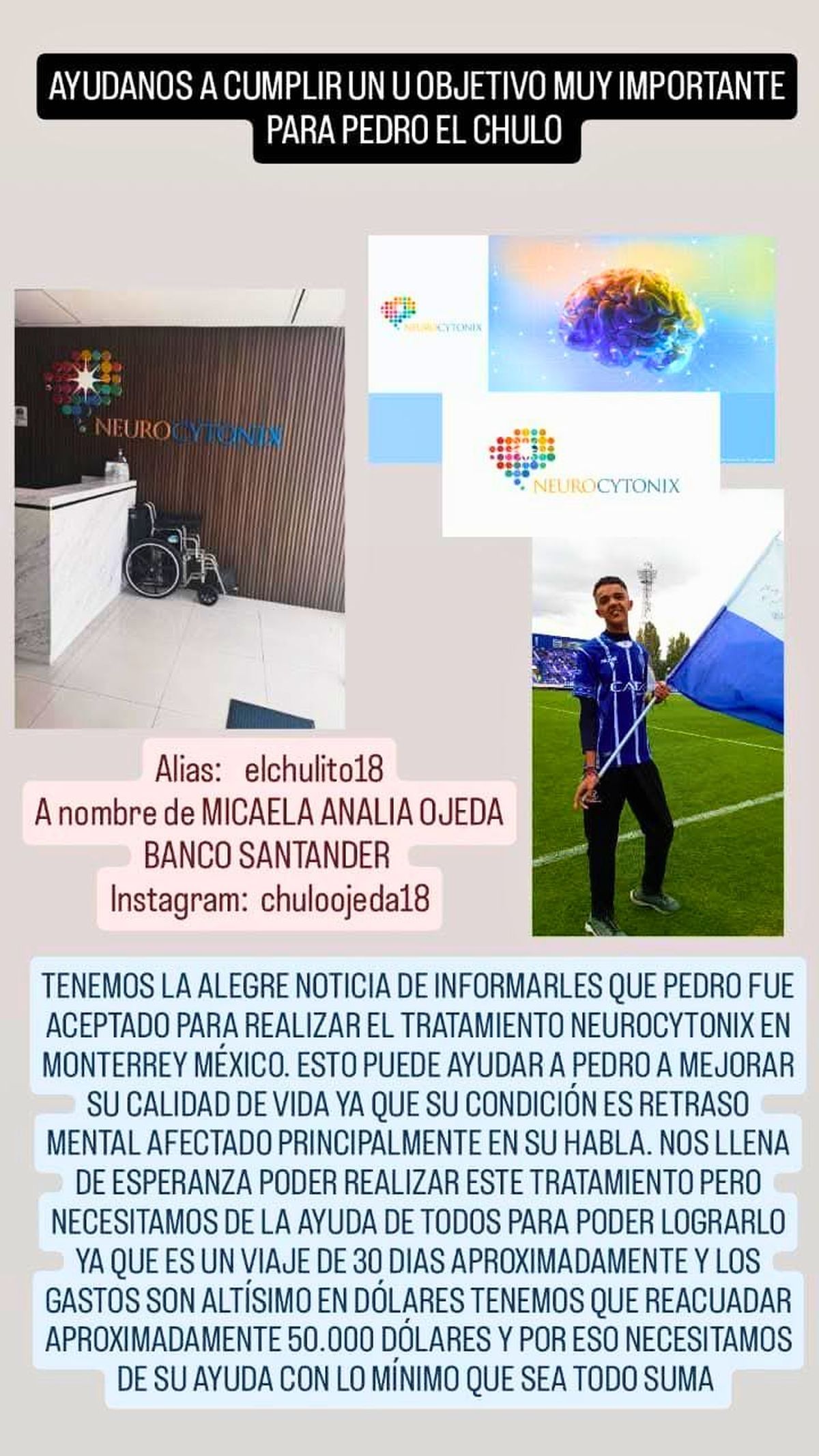 También se reciben aportes económicos a través del alias: elchulito18, a nombre de Micaela Analía Ojeda, en Banco Santander.
