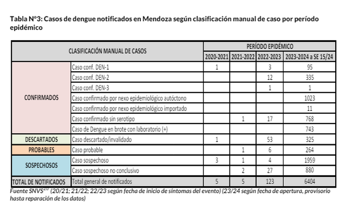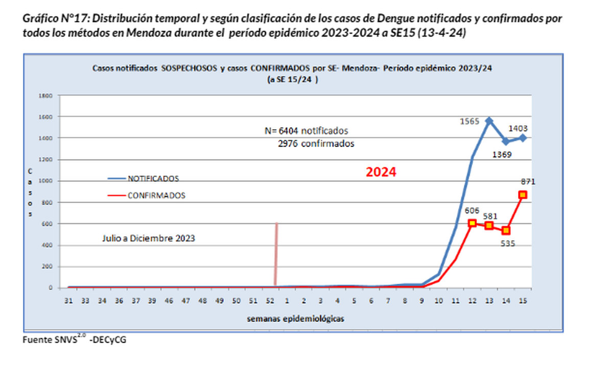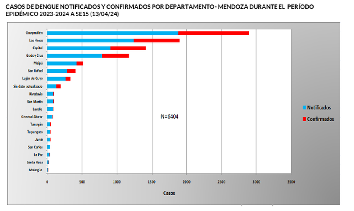El Ministerio de Salud y Deportes de Mendoza publicó este viernes el último boletín epidemiológico el que arrojó que al 13 de abril se confirmaron 2.976 contagios de dengue, mientras que 6.404 fueron denunciados. Estos datos corresponden al período epidemiológico 2023/2024.